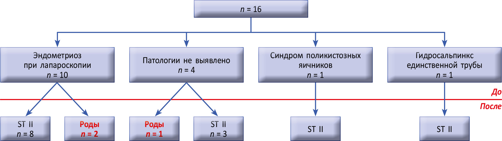 Рис. 6. Характеристика пациенток с вторичным бесплодием до и после метропластики. ST II (от лат. sterilitas) — вторичное бесплодие