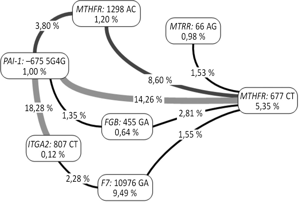 Fig. 1. Intergenic interactions of polymorphic loci of genes involved in hemostasis system and the folate cycle in preeclampsia. Strong synergy (light gray), moderate synergy (dark gray), additive interaction (black); interaction strength and direction is expressed in entropy, %