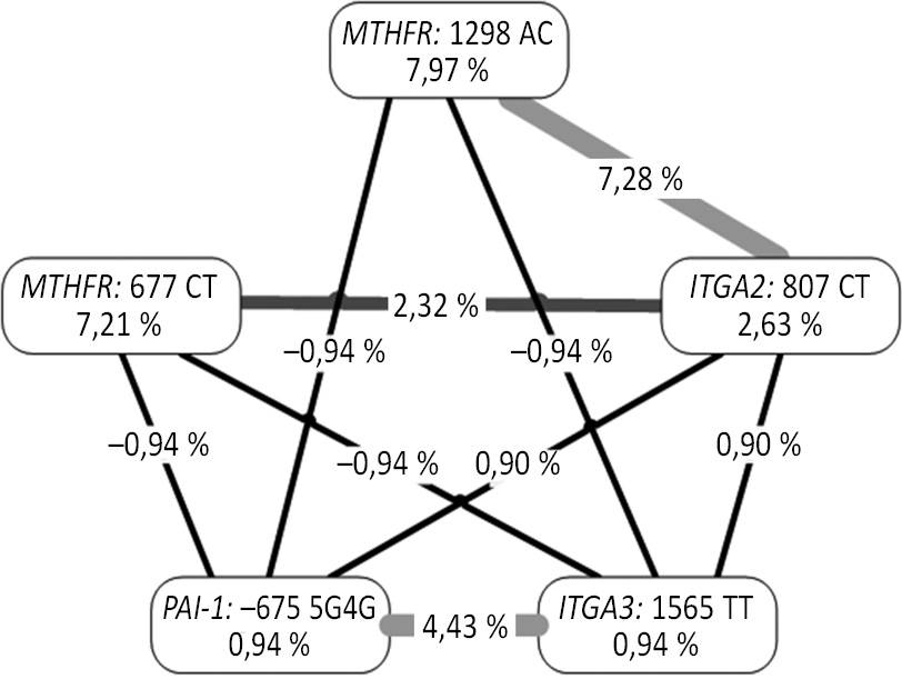 Fig. 2. Intergenic interactions of polymorphic loci of genes involved in hemostasis system and the folate cycle in healthy patients. Strong synergy (light gray), moderate synergy (dark gray), additive interaction (black); interaction strength and direction is expressed in entropy, %