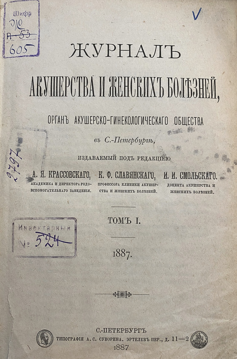 JOWD ceased to exist as an independent printed organ of the St. Petersburg Society of Obstetricians and Gynecologists (Petrograd, Leningrad) half a century after the first trial issue (1886).