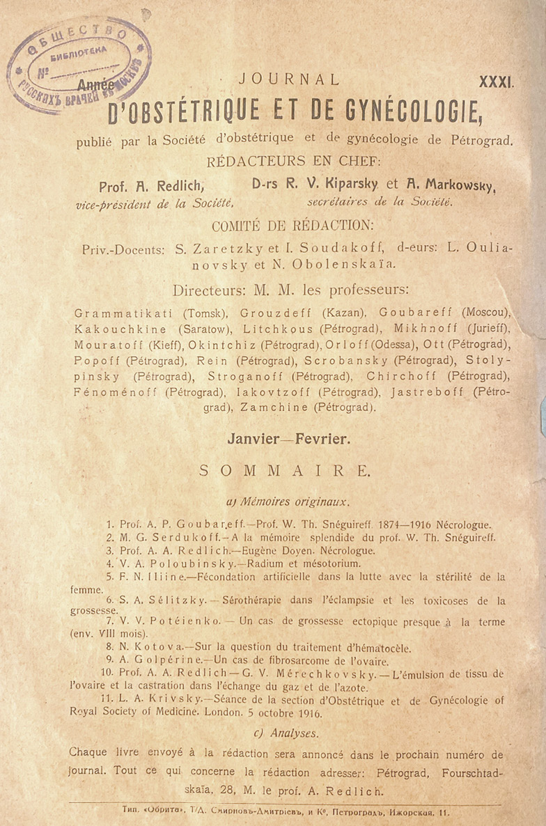 During the first decades of the 20th century, the JOWD was published as an organ of the St. Petersburg (Petrograd) Obstetrics and Gynecology Society. The journal was well-known not only in Russia at the time but also overseas, as evidenced by its publication in French (Figure 4). For 30 yr, the magazine, like a raised sail filled with wind, carried the ship of knowledge to the remote parts of Russia to “sow the reasonable, the good, the eternal.” The journal flourished amid Russia’s blooming of obstetric and gynecological science in 1917. Professor A.A. Redlich is the editor of the JOWD. It is impossible not to note the geographical diversity of the authors: contributions to the publications of those years were made on several occasions by well-known Russian academicians, such as I.N. Grammaticati (Tomsk), V.S. Gruzdev (Kazan), A.P. Gubarev (Moscow), A.I. Zamshin (Petrograd), N.M. Kakushkin (Saratov), S.D. Mikhnov (Yuriev), A.A. Muratov (Kiev), and V.N. Orlov (Odessa).