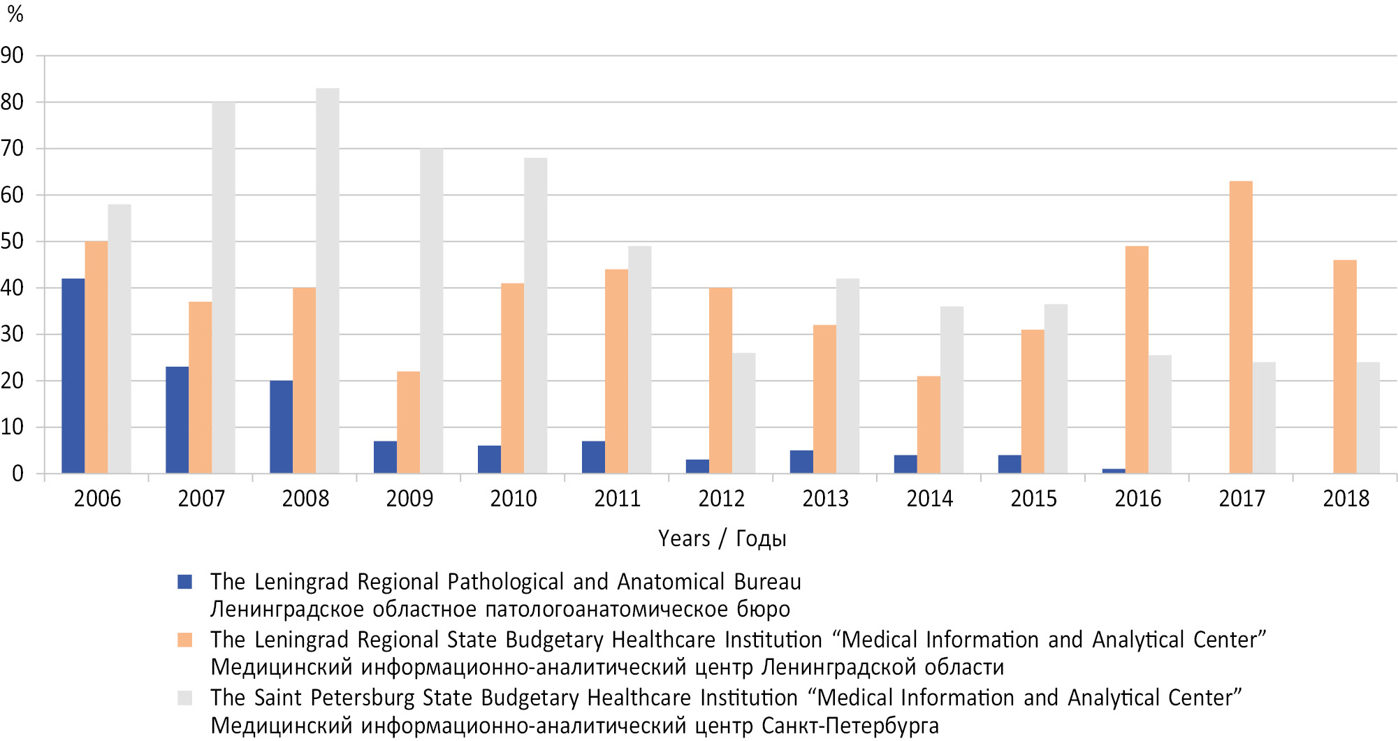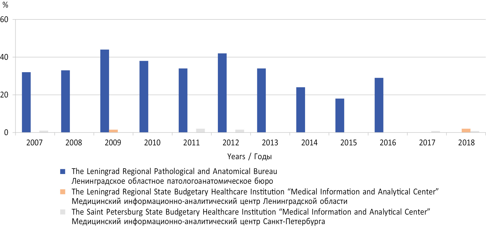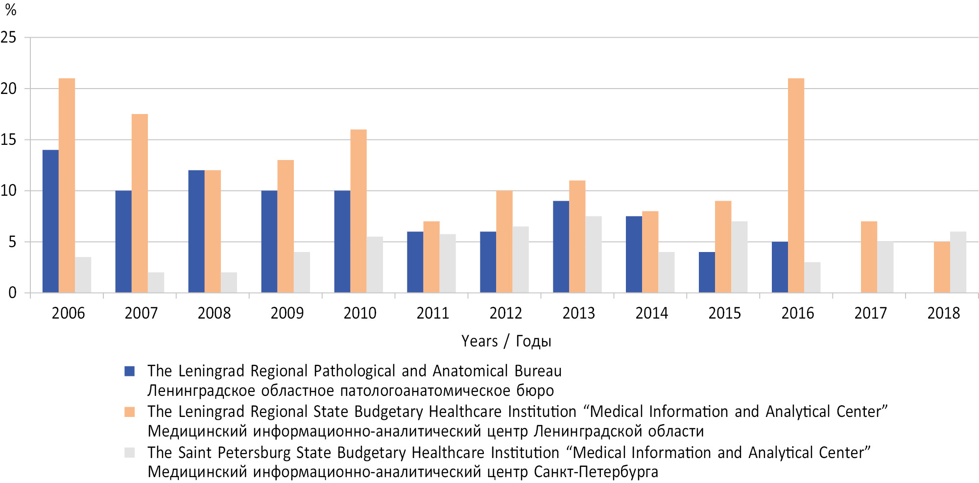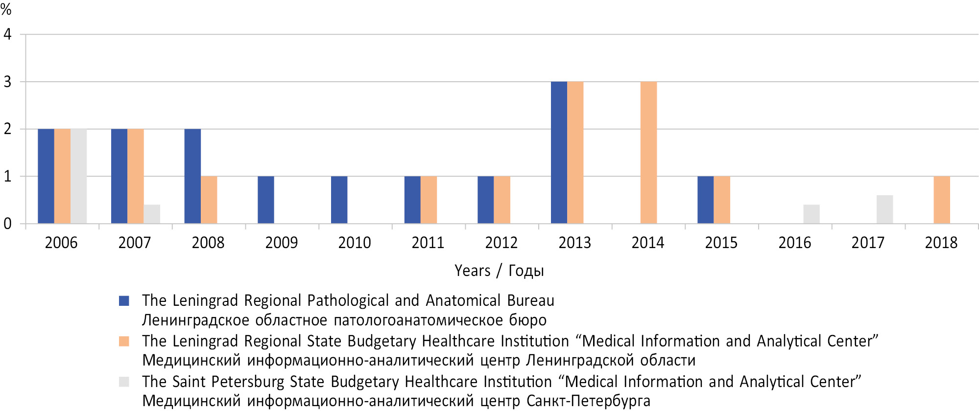 Based on the official reports of the St. Petersburg Medical Information and Analytical Center (MIAC SPb), the Leningrad Medical Information and Analytical Center (MIAC LR), and reports of the Leningrad Regional Anatomicopathological Bureau (LRAPB), the dynamics of the causes of perinatal losses in St. Petersburg and the Leningrad Region from 2006 to 2018 was analyzed. The LRAPB data for the period of 2006–2016 was presented because starting from 2017, the LRAPB report was compiled based on the diagnoses presented in the medical documentation, which duplicates the MIAC LR report.