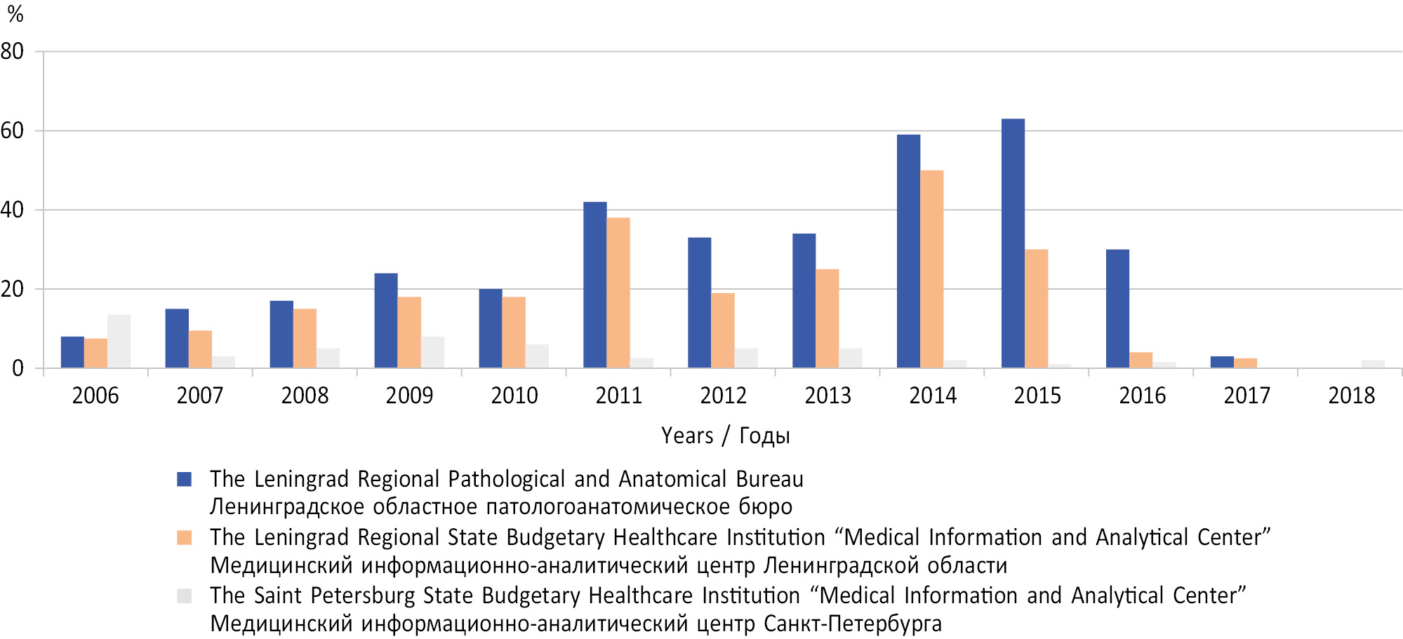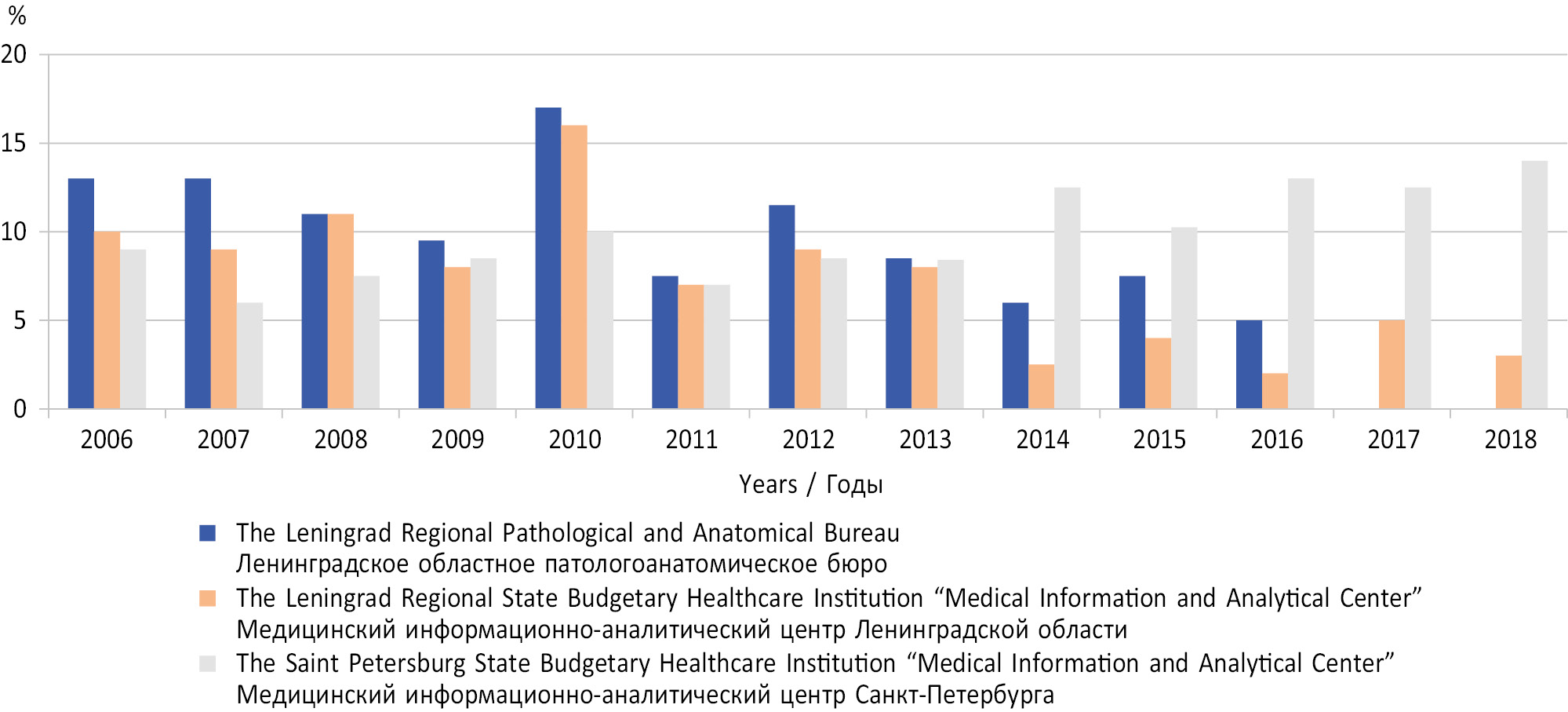Рис. 2. Частота неустановленной причины смерти в отчетных формах № 32 в 2006–2018 гг.