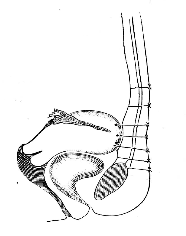 Вамъ извѣстно, мм. гг., что, выведя матку наружно-внутренними пріемами изъ состоянія перегиба или наклоненія назадъ, можно стараться удержать ее въ приданномъ ей положеніи различными способами (я говорю сегодня только объ оперативныхъ пріемахъ), причемъ или брюшная полость остается невскрытою, или же производится чревосѣченіе. Первый рядъ оперативныхъ пріемовъ заключаетъ въ себѣ 1) укороченіе круглыхъ связокъ матки (abbreviatio ligg. rotundorum, Alquié-Alexander) и 2) наложеніе шва черезъ всю толщу брюшныхъ стѣнокъ и дно матки безъ вскрытія брюшины. Объ операціи укороченія круглыхъ связокъ я уже не разъ имѣлъ случай высказываться и сегодня позволю себѣ только замѣтить, что я примѣнилъ ее въ 10-ти случаяхъ и думаю, что больше производить ее не буду, не потому, однако, чтобы я убѣдился въ недѣйствительности самой операціи или возможности какихъ-либо неблагопріятныхъ послѣдующихъ за ней явленій, а единственно потому, что отысканіе наружнаго конца круглой связки не всегда возможно, не только у живой женщины sub operatione, но даже на трупѣ при тщательномъ анатомическомъ изслѣдованіи. Операція, которой присуща возможность остаться неоконченною вслѣдствіе ненахожденія ея объекта, не можетъ разсчитывать на широкое распространеніе.