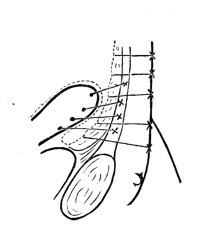 Прежде чѣмъ перейти къ оцѣнкѣ, какъ самой гистеропексіи, такъ и даваемыхъ ею результатовъ, я позволю себѣ сказать нѣсколько словъ о техникѣ ея производства. — Обстановка операціи, какъ и всякаго чревосѣченія, или еще болѣе — какъ каждаго хирургическаго вмѣшательства (I. Neudӧrfer.VonderAntiseptik zur Aseptik. Klinische Zeit-und Streitfragen. 1890. IV. Heft. 9), должна быть строго асептична. Положеніе больной — съ сильно приподнятымъ тазомъ на наклонной плоскости; удобство такого положенія оперируемой при чревосѣченіяхъ уже не разъ было испытано мною: дѣйствительно, петли кишекъ при этомъ, въ силу собственной тяжести, легко отходятъ въ куполъ грудобрюшной преграды и, благодаря этому, не мѣшаютъ ясно видѣть расположеніе тазовыхъ внутренностей. По разрѣзѣ брюшной стѣнки, введенною въ полость живота рукою исправляется положеніе матки, и дно ея устанавливается въ нижнемъ углѣ раны. Для наложенія шва я предпочитаю простую стерилизованную пли іодоформированную шелковую лигатуру, оба конца которой вдѣты въ изогнутыя иглы, отличающіяся отъ обыкновенныхъ хирургическихъ иголъ отсутствіемъ ланцетовиднаго расширенія ихъ острыхъ концовъ, благодаря чему такія иглы только колятъ, но не рѣжутъ. Одна изъ двухъ иголъ, удерживаемая любымъ иглодержателемъ, проводится слѣва направо черезъ толщу передней стѣнки матки между мѣстами отхожденія круглыхъ связокъ и затѣмъ прокалывается изнутри кнаружи черезъ правый край брюшной раны; другая игла проводится затѣмъ такимъ же образомъ черезъ лѣвый край раны. Слѣдующій шовъ накладывается тѣмъ же порядкомъ на 0,5 ctm. ниже перваго, и такъ же далѣе книзу могутъ быть наложены еще одинъ или два шва. При проведеніи иглы черезъ стѣнку матки необходимо строго слѣдить за тѣмъ, чтобы все время оставаться въ ея толщѣ и никоимъ образомъ не проникать иглою въ полость матки, такъ какъ подобное пораненіе можетъ обусловить переносъ содержимаго матки въ полость брюшины, чтó далеко не во всѣхъ случаяхъ можетъ считаться индифферентнымъ. Дѣлая сообщеніе въ нашемъ Обществѣ болѣе 11/2 лѣтъ тому назадъ (К. Славянскій. Краткій отчетъ о хирургическомъ лѣченіи гинекологическихъ больныхъ въ клиникѣ съ 1-го по 23-го марта 1889 г.) и упоминая между прочимъ о двухъ случаяхъ ventrofixationis, я указалъ тогда, что они были произведены по такъ называемому способу Leopold’а, при которомъ лигатуры, удерживающія матку, проводятся черезъ всю толщу брюшныхъ стѣнокъ и затѣмъ черезъ извѣстное время послѣ операціи удаляются (рис. 1);
