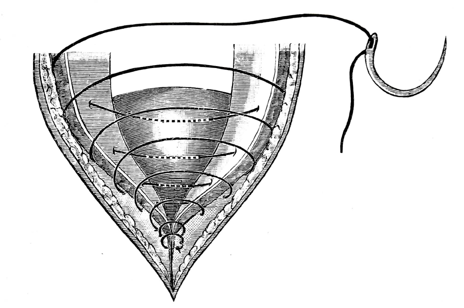 Накладывать шовъ черезъ брюшную стѣнку и дно матки, не вскрывая первой, предлагалъ въ былое время Sims, а въ новѣйшее время это предложеніе возобновили Kelly, Сапеѵа и Candella. Матка наружно-внутренними пріемами приподымается, дно ея удерживается у передней брюшной стѣнки, и затѣмъ большая игла съ лигатурою проводится черезъ всю толщу брюшной стѣнки и дно матки (М. Sims, Kelly), или же брюшная стѣнка разрѣзается до брюшины, и швы накладываются на послѣднюю и дно матки (Сапеѵа). Candella, профессоръ въ Валенсіи, съ тою же цѣлью пользуется особо устроенною иглою съ канюлею, которую онъ проводитъ черезъ полость вправленной матки и выводитъ черезъ брюшныя стѣнки наружу; двѣ подобныя лигатуры проводятся такимъ образомъ черезъ оба угла матки.
