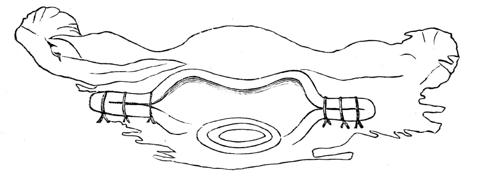 Въ свое время были предложены также методы не непосредственнаго пришиванія матки, причемъ она фиксировалась спереди, благодаря пришиванію къ брюшной стѣнкѣ мѣстъ отхожденія отъ нея широкихъ связокъ или же благодаря укороченію круглыхъ связокъ путемъ наложенія на нихъ извѣстнымъ образомъ лигатуръ (рис. 4), вслѣдствіе чего на нихъ образуются складки, и онѣ значительно укорачиваются.