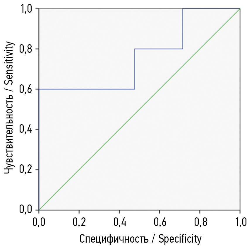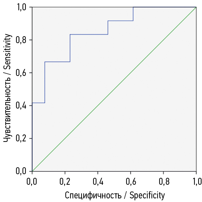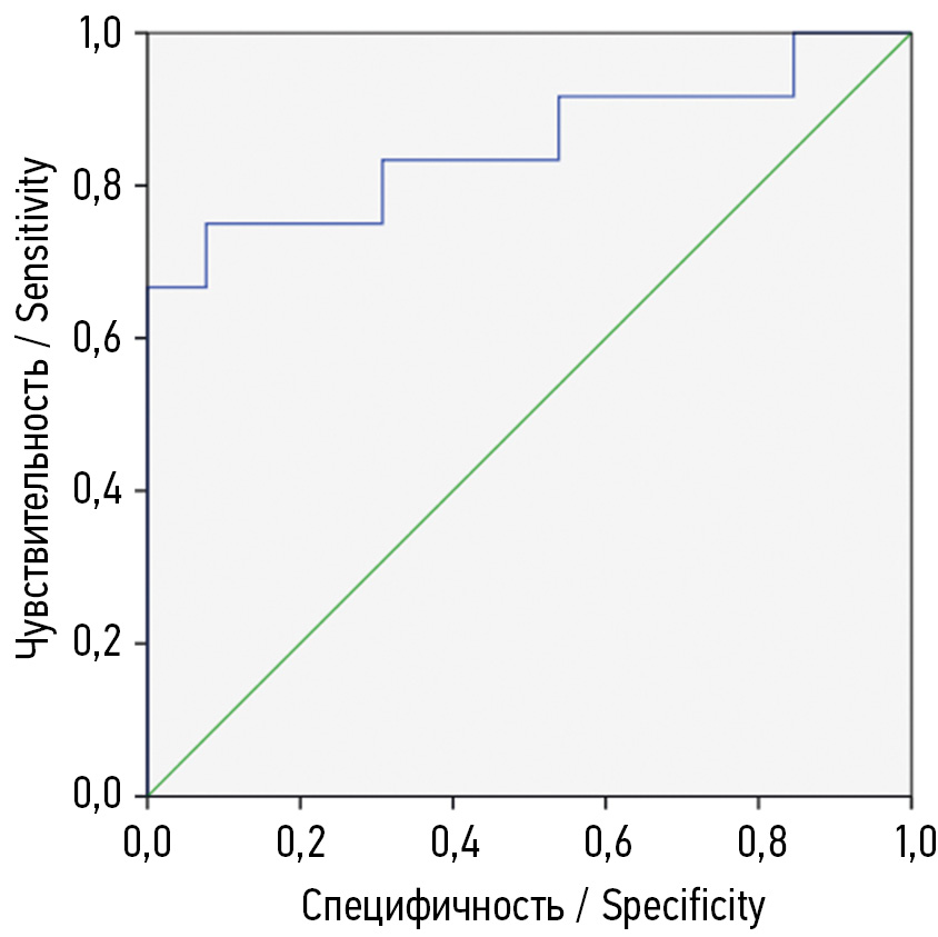 Для исследования прогностической ценности модели проведен ROC-анализ (табл. 7). ROC-кривая модели представлена на рис. 2. Качество распознавания модели оценивали по площади под характеристической кривой. При значениях от 0,8 до 0,9 качество модели определено как «очень хорошее» [11]. Для полученной модели площадь под характеристической кривой была больше 0,8.