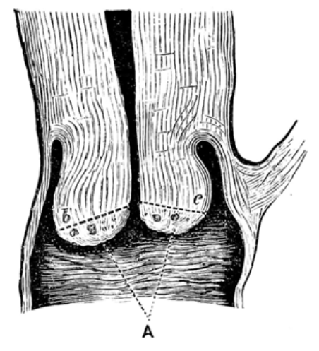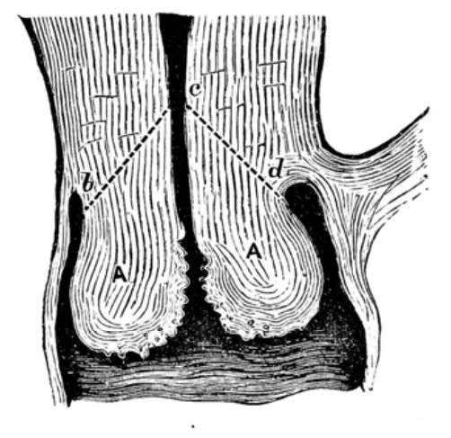 Затѣмъ, раскаленнымъ, лучше изогнутымъ, наконечникомъ проводится циркулярная линія по всей периферіи влагалищной части близь прикрѣпленія къ ней сводовъ или отступя отъ нихъ болѣе или менѣе книзу, смотря потому, какой величины кусокъ влагалищной части требуется удалить. Дѣлая раскаленнымъ наконечникомъ по намѣченной такимъ образомъ линіи пилообразныя движенія или просто уколы, ампутируемъ наконецъ всю влагалищную часть. На рис. 1 изображенъ такой способъ ампутаціи, гдѣ буква А — обозначаетъ кусокъ, подлежащій удаленію, а линія bc — направленіе разрѣза. Вслѣдствіе постояннаго потягиванія пулевыми или Мюзеевскими щипцами за ампутируемую часть прижженная поверхность разрѣза по окончаніи операціи получается нѣсколько вогнутой. Такой способъ ампутаціи показанъ при гипертрофіи влагалищной части, при хроническомъ воспаленіи только ея или самой матки, при разрывахъ влагалищной части съ выворотомъ губъ, при карциномахъ и другихъ новообразованіяхъ ея. Гораздо чаще, однако, употребляется второй способъ ампутаціи — это вырѣзыванія конусообразнаго куска или, такъ называемая, коническая эксцизія влагалищной части. При этомъ въ случаяхъ, гдѣ требуется удалить небольшой кусокъ ткани, напримѣръ, при glandular’ныхъ эрозіяхъ, тамъ влагалищная часть для фиксаціи захватывается пулевыми щипцами выше того участка, который долженъ быть удаленъ, такъ какъ этотъ послѣдній иногда бываетъ настолько тонокъ, что его трудно захватить щипцами. Всего удобнѣе его удерживать широкимъ крючковатымъ пинцетомъ. Здѣсь также, какъ и въ первомъ случаѣ операція начинается съ того, что раскаленнымъ наконечникомъ проводится циркулярная линія на границѣ между эрозированной поверхностью и нормальной слизистой оболочкой влагалищной части. При дальнѣйшихъ манипуляціяхъ прямымъ наконечникомъ, этотъ послѣдній должно держать подъ болѣе или менѣе острымъ угломъ къ наружной поверхности влагалищной части, благодаря чему разрѣзъ въ области цервикальнаго канала приходится гораздо выше наружнаго разрѣза и получается воронкообразная раненая поверхность, между тѣмъ какъ удаленный кусокъ является въ видѣ лоскута болѣе или менѣе равномѣрной толщины. Такой способъ отжиганія изображенъ на рис. 2. Буква А обозначаетъ кусокъ, подлежащій удаленію, а линія bc направленіе разрѣза. — Въ тѣхъ случаяхъ, гдѣ требуется удалить большой участокъ ткани, тамъ влагалищная часть захватывается Мюзеевскими щипцами въ области наружнаго зѣва и первоначальный разрѣзъ дѣлается гораздо выше, приблизительно на мѣстѣ прикрѣпленія сводовъ. Вытягивая влагалищную часть щипцами и направляя раскаленный наконечникъ въ толщу влагалищной части такъ же, какъ и въ первомъ случаѣ подъ болѣе или менѣе острымъ угломъ къ ея наружной поверхности, можно отрѣзать шейку матки на любой высотѣ. Вслѣдствіи такихъ манипуляцій рана получается въ видѣ болѣе или менѣе глубокой воронки съ вершиной обращенной къ внутреннему зѣву. Края же ея находятся на мѣстѣ прикрѣпленія сводовъ. На рис. 3 буква А обозначаетъ кусокъ, подлежащій удаленію, линія bcd — направленіе разрѣза.