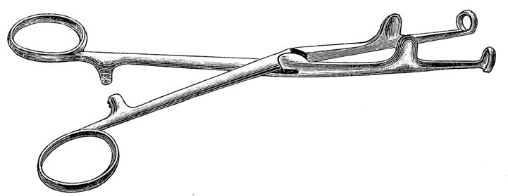 Мѣсто перекреста обѣихъ вѣтвей приходится нѣсколько ближе къ концу щипцовъ: разстояніе перекреста отъ конца ветвей = 9,0 до 12,0 ctm. Рукоятки щипцовъ, какъ это видно изъ приложеннаго рисунка, ничѣмъ не отличаются отъ обыкновенныхъ гэмостатическихъ щипцовъ и снабжены крѣпкими зубцами. Короткія вѣтви щипцовъ имѣютъ на своихъ концахъ кольца, предназначенныя для проведенія черезъ нихъ жгута. Чтобы по возможности избѣжать всякаго тренія во время затягиванія жгута, плоскость каждаго отдѣльнаго кольца росположена по отношенію вѣтвей щипцовъ не подъ прямымъ угломъ, а нѣсколько косо; причемъ плоскости колецъ обращены нѣсколько кнаружи, въ разсчетѣ, что при этомъ жгутъ будетъ испытывать наименьшее треніе, какъ какъ онъ будетъ пересѣкать плоскость кольца подъ угломъ въ 90°.