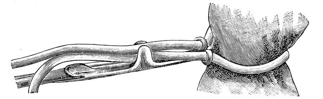 Этимъ преимуществомъ моего инструмента придется пользоваться конечно лишь въ исключительныхъ случаяхъ, такъ какъ продѣваніе концовъ жгута въ указанныя выше кольца не представляетъ никакого затрудненія и во время самой операціи.