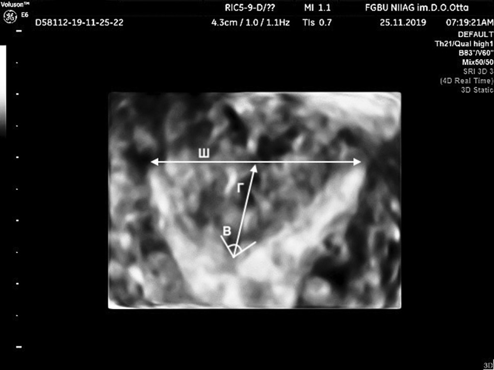 Fig. 4. 3D ultrasound reconstruction of the uterine cavity: normal uterus, where Ш, uterine cavity width; Г, cavity indentation; B, angle of cavity indentation