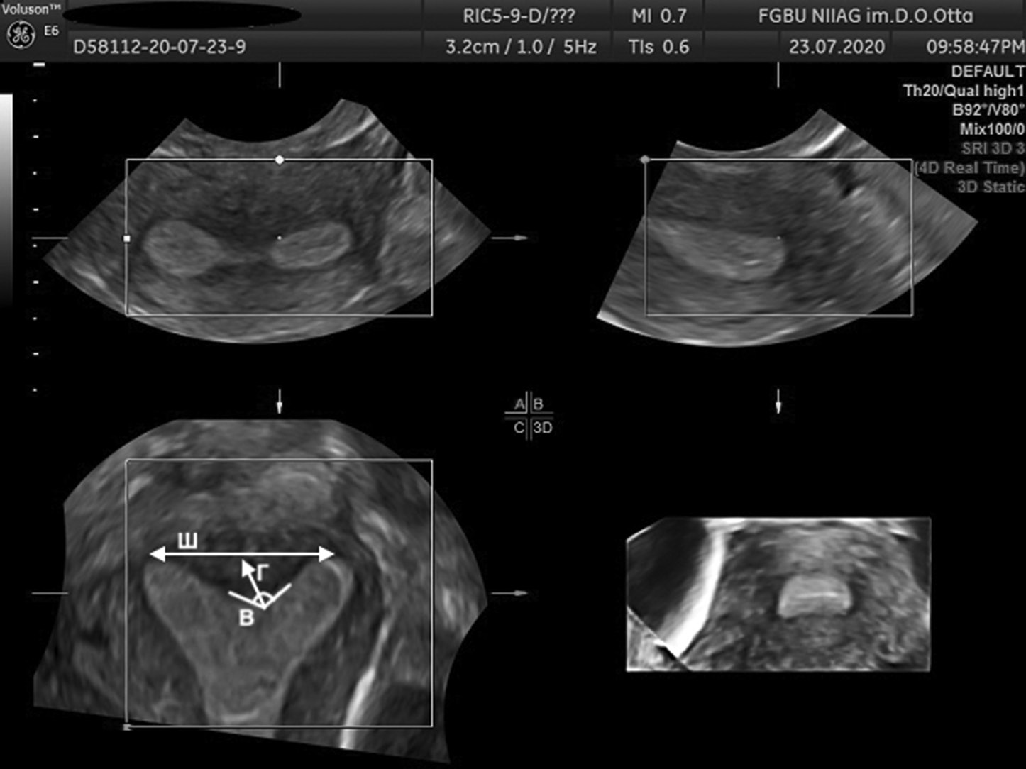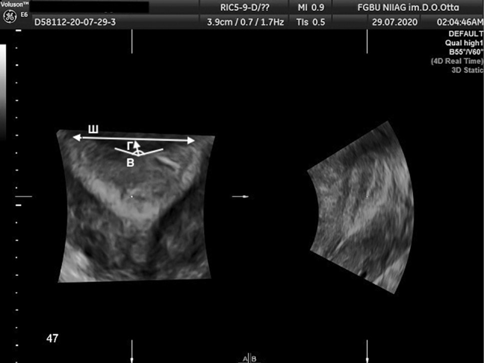 Fig. 3. 3D ultrasound reconstruction of the uterine cavity: bicornuate uterus, where Ш, uterine cavity width; Г, cavity indentation; B, angle of cavity indentation