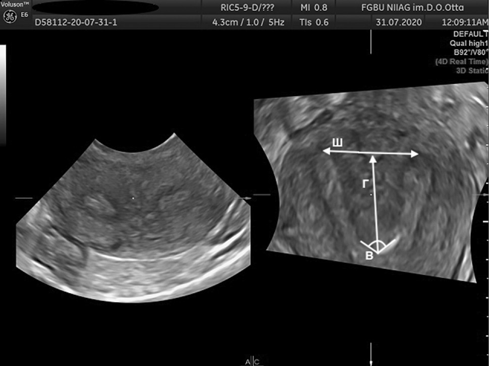 Fig. 2. 3D ultrasound reconstruction of the uterine cavity: arcuate uterus, where Ш, uterine cavity width; Г, cavity indentation; B, angle of cavity indentation (120°)