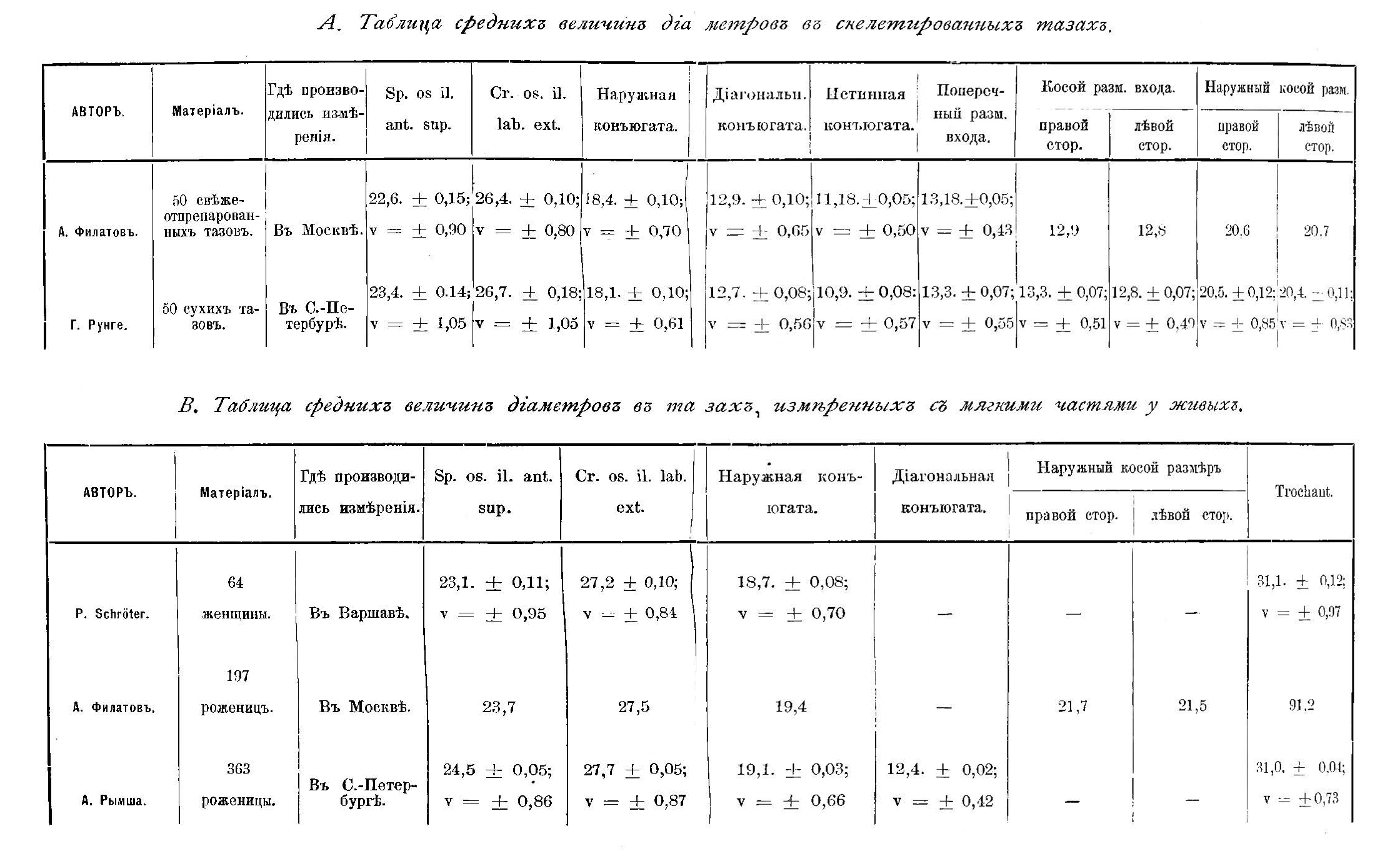 Первую главу своей прекрасной диссертаціи Филатовъ посвятилъ весьма тщательной разработкѣ всѣхъ сочиненій, трактующихъ о племенныхъ различіяхъ тазовь. Затѣмъ онъ переходитъ къ разсмотрѣнію таблицы размѣровъ тазовъ европейскихъ пародовъ, составленной имъ по даннымъ нѣмецкихъ, французскихъ и англійскихъ сочиненій, но притомъ только такихъ, въ которыхъ можно было встрѣтить указанія, что приведенные въ нихъ размѣры опредѣлены или провѣрены авторами лично. «Какъ видно изъ сравнительной таблицы—говоритъ Филатовъ—полнаго согласіи въ измѣреніяхъ отдѣльныхъ авторовъ нѣтъ, по разногласіе значительно больше между авторами различныхъ національностей. Выводить среднія цифры изъ среднихъ величинъ различныхъ авторовъ, какъ это сдѣлалъ Marlin, едва ли будетъ правильно, такъ какъ приведенныя авторами среднія, выведены изъ различнаго, по обыкновенію не упоминаемаго количества, измѣреній, а потому остается принять за средніе размѣры таза данной національности тѣ числа, въ которыхъ согласны большинство ея авторовъ». Получивъ такимъ образомъ возможность сравнить тазъ русскій съ тазами другихъ племенъ, Филатовъ переходитъ во второй главѣ къ собственнымъ измѣреніямъ.