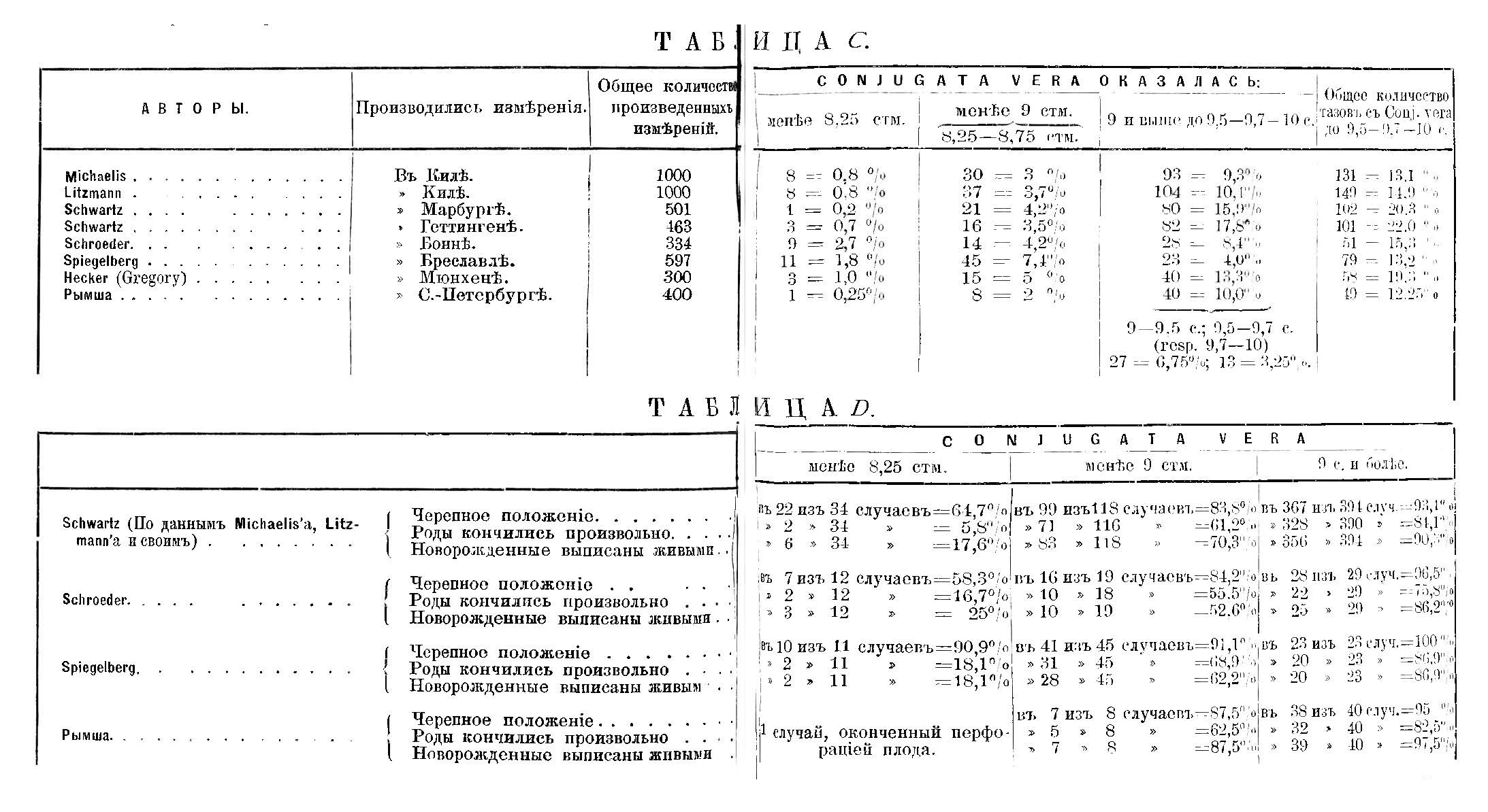 Не смотря на то Schroeder на вопросъ, куда слѣдуетъ согласно съ этимъ воззрѣніемъ передвинуть границу для узкаго таза, не рѣшается дать опредѣленнаго отвѣта и при выведеніи частоты узкихъ тазовъ руководствуется недостаточною по его же мнѣнію границею, постановленною Litzmann’омъ. Такимъ образомъ на 321 родовъ въ Боннѣ Schroeder опредѣлилъ 47 осложненныхъ узкими тазами (14,64%), причемъ высшій предѣлъ для плоскихъ тазовъ составляла Conj. vera до 9,5 стм., для неравномѣрно обще-съуженныхъ тазовъ до 9,7, а для равномѣрно обще-съуженныхъ Conj. vera до 10,0 стм.