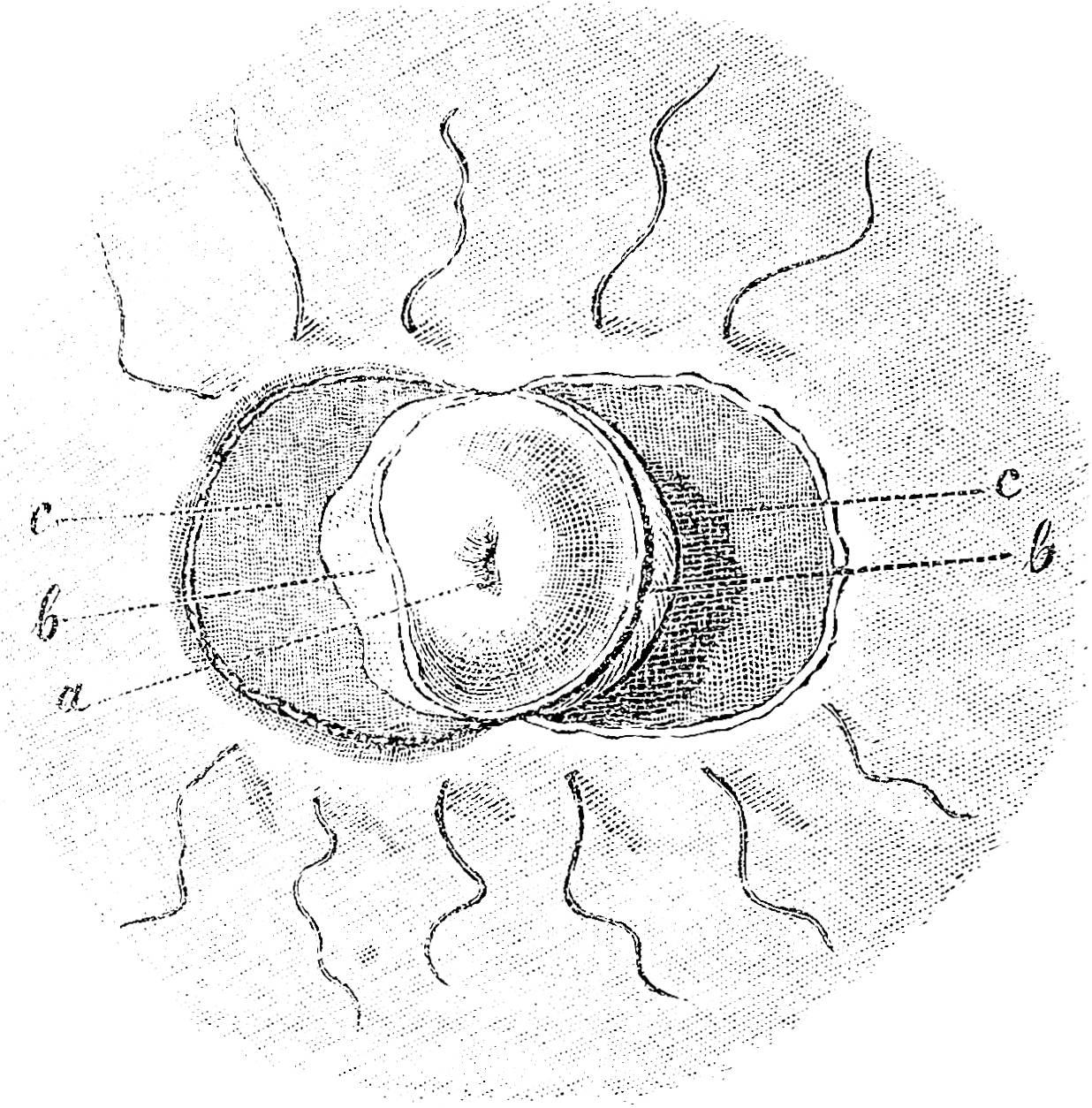 Рис. 1. a—Orif. extern. urethrae; b― отсепарованный боковой лоскутъ; с—окровавленныя поверхности, оставшіяся по отсепарованіи лоскутовъ и сшитыя въ направленіи сверху внизь.