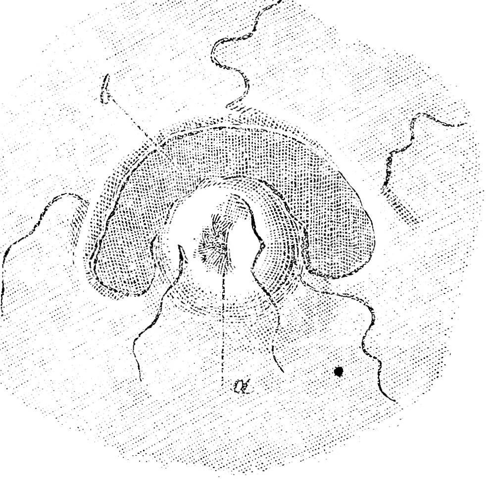 Съ цѣлью перегнуть уретру, притянуть нижній отдѣлъ ея къ лонному соединенію, я поступилъ слѣдующимъ образомъ: между симфизомъ и верхней стѣнкой мочеиспускательнаго канала я вырѣзалъ дугообразной формы широкій клинъ, концы котораго огибали съ боковъ уретру почти до нижней стѣнки ея. (Рис. 2).