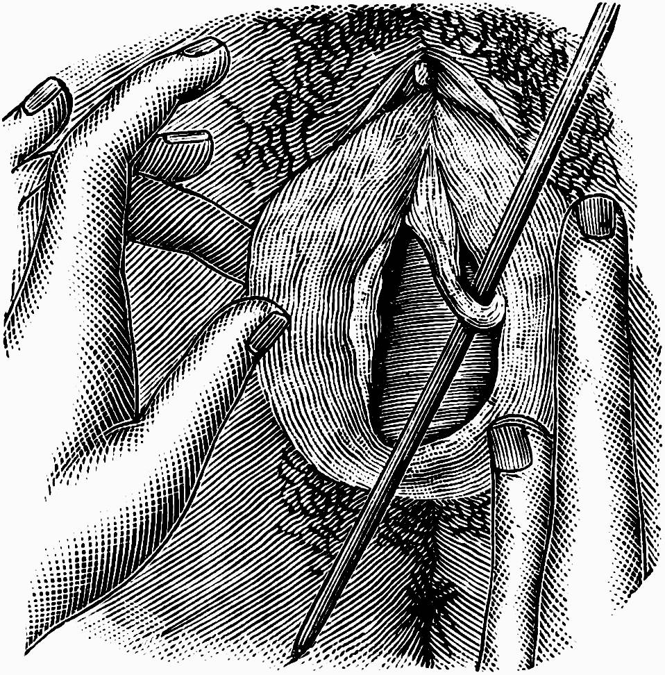 Въ 1881 г. больная сошлась съ другимъ мужчиной, coitus’ съ которымъ опять вызывали повторныя кровотеченія и боли, что и заставило больную обратиться къ автору. При осмотрѣ онъ нашелъ во входѣ въ рукавъ круглое эластичное кольцо, въ 3—4 m.m. толщиною, прикрѣпленное на правой передней стѣнкѣ уретры ножкою въ 1 ctm. ширины. Размѣры кольца 3 ctm. На внутренней стѣнкѣ кольцо имѣетъ надрывы и одинъ изъ нихъ свѣжій съ экхнмозомъ. Это-то кольцо несовершенно оторваннаго гимена и давало боли и кровотеченія.