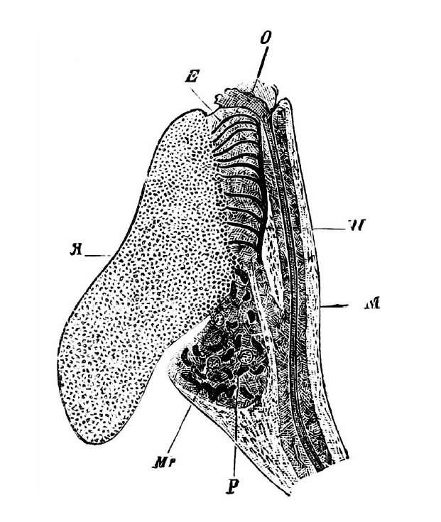 Новообразованія яичника съ анатомической точки зрѣнія дѣлятся на двѣ большія группы: на образованія эпителіальныя и на образованія ряда соединительной ткани, смотря по тому, участвуетъ ли въ развитіи ихъ паренхима или строма яичника. Къ первымъ относятся кисты, кистомы, эндотеліомы и раки, ко вторымъ фибромы, саркомы и весьма рѣдко встрѣчающіяся ангіомы, міомы, энхондромы и остеомы. Источниками развитія опухолей яичника могутъ служить иногда также образованія, не принадлежащія собственно ни къ его паренхимѣ, ни къ его стромѣ, а представляющія изъ себя только остатки прежде существовавшихъ во время зародышевой жизни органовъ, помѣщавшихся рядомъ съ нимъ. Съ теченіемъ времени органы эти атрофируются и иногда только представляютъ сохранившими свои части, заходящія черезъ hylus ovarii далеко въ его строму. Прилагаемый рисунокъ (рис. 1) изображаетъ внутренніе половые органы зародыша дѣвочки, какими они представляются въ началѣ четвертаго мѣсяца зародышевой жизни. Рядомъ съ яичникомъ (я), заключеннымъ между листками lig. lati, рѣзко различаются остатки Вольфова тѣла, ясно раздѣленнаго на двѣ части Е — придатко-яичковую и Р — примордіально-почечную часть. Первая изъ нихъ преобразуется у мужчины въ придатокъ яичка—epididymis, а вторая въ такъ называемый corpus innominatum Giraldes или Parepididymis (Henle) s. Paradidymis (Waldeyer). У женщины эти органы хотя и атрофируются въ весьма значительной степени, но все таки они могутъ быть найдены при тщательномъ анатомическомъ изслѣдованіи въ видѣ болѣе или менѣе хорошо сохранившихся железистыхъ каналовъ, помѣщающихся