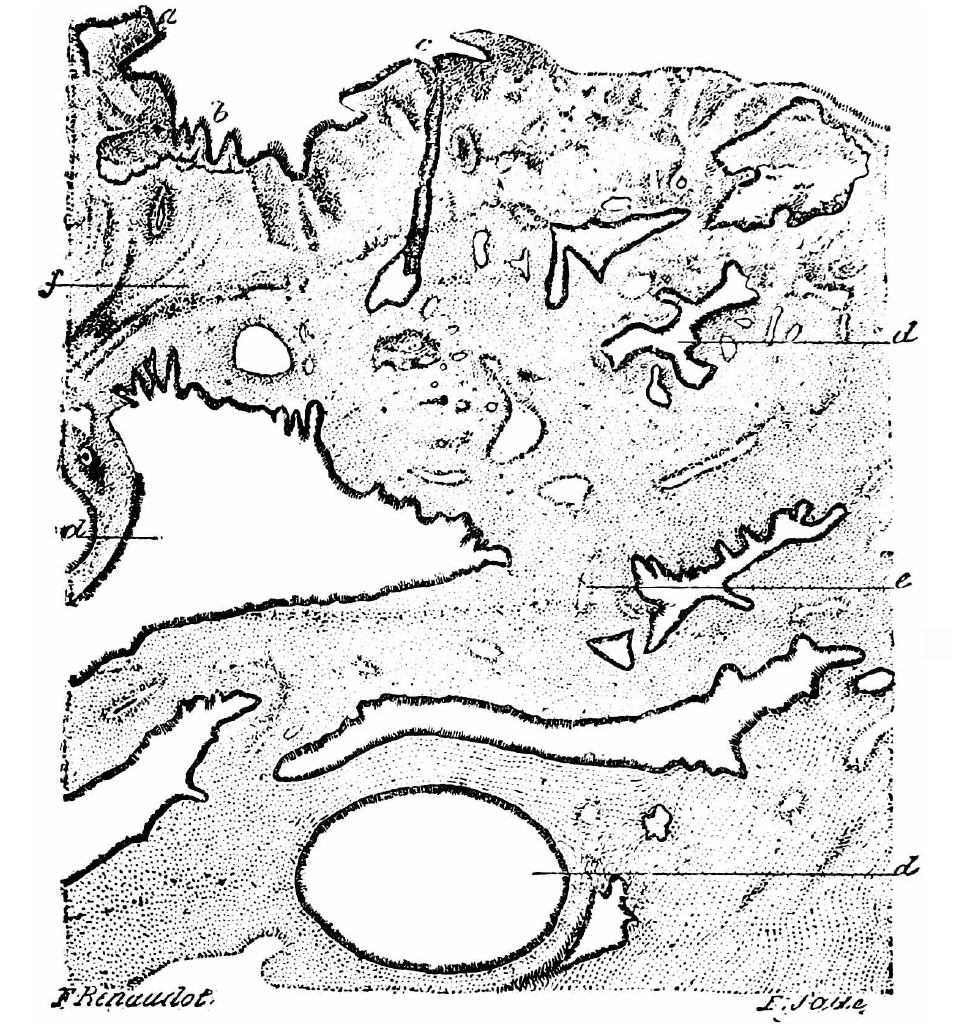 Fig.: 2. (de Sinety) a. - Embryonic epithelium of the ovarian surface. b. - Epithelial impressions. from. - An epithelial tube that opens on the surface of the ovary. d. - cystic cavities of various sizes and shapes. e. - blood vessels. f. - Ovarian stroma.