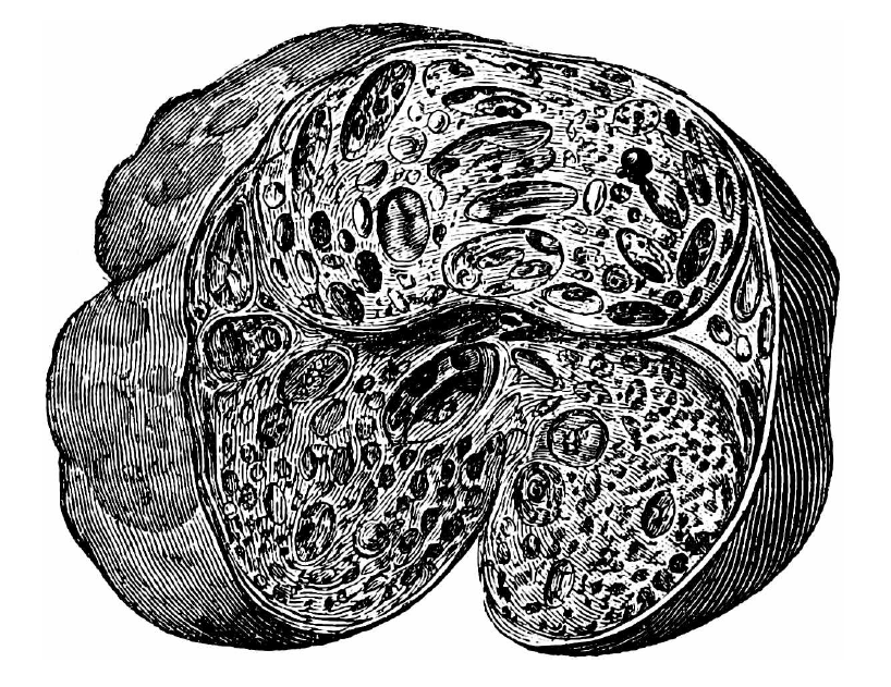 Железистыя кистомы въ разрѣзѣ представляютъ конгломератъ кистъ различной величины; смотря по характеру этихъ послѣднихъ, мы различаемъ железистыя кистомы, обладающія массою кистъ, недостигающихъ большихъ размѣровъ и представляющихся болѣе или менѣе одинаковой величины (рис. 3), такъ что поверхность разрѣза такой кистомы весьма походитъ иногда на соты. Ростъ опухолей этого вида обыкновенно относительно медленный и только рѣдко онѣ достигаютъ очень большихъ размѣровъ. Болѣе часто, чѣмъ кистомы съ мелкими полостями встрѣчаются опухоли, содержащія одну