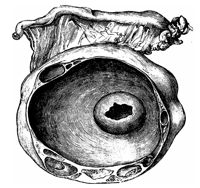 Кисты однополосныя. Большею частью однополостныя кисты яичника встрѣчаются развивающимися въ его кортикальномъ слоѣ и только гораздо болѣе рѣдко въ медуллярномъ. Нашему наблюденію они представляются обыкновенно въ видѣ небольшихъ кистовидныхъ полостей, величиною отъ коноплянаго зерна до большой вишни, располагающихся непосредственно въ ткани яичника; рѣже уже приходится ихъ встрѣчать достигающими объема кулака или головы взрослаго человѣка и только въ исключительныхъ случаяхъ объемъ ихъ достигаетъ объема беременной матки конца беременности, такъ что такая киста выполняетъ почти всю брюшную полость. Кисты большія встрѣчаются почти всегда одиночными, недостигающія же особенно большихъ размѣровъ—величиною отъ вишни до апельсина—почти всегда сопровождаются развитіемъ нѣсколькихъ кистъ гораздо меньшей величины въ уцѣлѣвшей еще ткани яичника. Гораздо болѣе уже рѣдко встрѣчаются двѣ-три кисты одинаковыхъ болѣе значительныхъ размѣровъ, занимающихъ почти весь яичникъ, въ остающейся части котораго могутъ быть все таки найдены еще нѣсколько болѣе мелкихъ кистъ величиною отъ коноплянаго зерна до горошины. Болѣе тонкое анатомическое строеніе образованій, имѣющихъ видъ однополостныхъ кисть, при изслѣдованіи простымъ глазомъ представляется весьма разнообразнымъ. Въ большей части случаевъ оказывается, что мы имѣемъ передъ собою, при изслѣдованіи полости, не превышающей величину большой вишни, различной величины болѣе или менѣе зрѣлые Граафовы пузырьки. Микроскопъ показываетъ вполнѣ нормальное ихъ строеніе, съ хорошо выраженными клѣтками membranae granulosae и рѣзко опредѣлимымъ яйцомъ со всѣми его особенностями, только соединительнотканная часть ихъ стѣнки представляется нерѣдко сильно гиперемированной и количество, блуждающихъ тѣлъ (бѣлыхъ кровяныхъ шариковъ) въ трабекулярномъ слоѣ рѣзко увеличено.