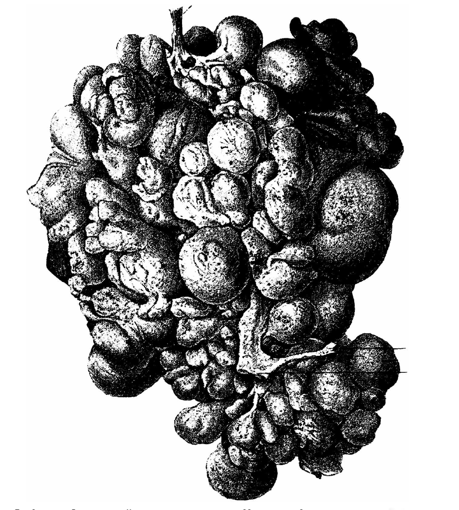 Общій видъ железистой кистомы, обладающей большою полостью и нѣсколькими мелкими кистами представляется обыкновенно шарообразнымъ. Развитіе большаго числа вторичныхъ кистъ, выдающихся надъ наружною поверхностью опухоли, обусловливаетъ мелко или крупно бугристый видъ ея; при существованіи крупныхъ бугровъ опухоль можетъ представляться какъ бы состоящею изъ нѣсколькихъ частей съ глубокими перехватами между ними, Совершенно особенную форму принимаетъ наружный видъ опухоли въ случаяхъ, когда вторичныя кисты настолько выдаются надъ наружною поверхность, что представляются сидящими на ножкѣ (рис. 5), напоминая собою какъ бы колоссальной величины пузырчатый заносъ или кисть винограда. (Ohlshausen, Schroeder, Hofmeyer). Подобное полипозное, гроздеобразное расположеніе кистъ представляется явленіемъ довольно рѣдкимъ и исторія ихъ происхожденія еще не достаточно выяснена.