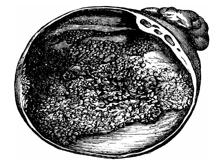 Содержимое полостей сосочковой кистомы не представляется никогда такимъ густымъ, студенеобразнымъ, какъ это мы видѣли въ железистыхъ кистомахъ, оно гораздо жиже, прозрачно и окрашено въ различные цвѣта, смотря по количеству излившейся крови и давности экстравазата; эти особенности находятъ себѣ полное объясненіе въ рѣдкости нахожденія бокальчатыхъ клѣтокъ эпителія и въ присутствіи обильной сѣти сосудовъ, лежащей нерѣдко тотчасъ подъ эпителіальнымъ покровомъ. Сосочки внутренней поверхности кистъ, обладающіе большимъ количествомъ соединительной ткани, представляются гораздо болѣе тихо ростущими, сосочковыя же разрощенія, состоящія почти исключительно изъ эпителія и имѣющія только незначительную соединительнотканную основу, ростутъ весьма быстро, скоро выполняютъ всю полость кисты, со стѣнки которой онѣ начинаютъ разростаться и мало-по-малу продыравливаютъ стѣнку такъ, что проникаютъ или въ одну изъ сосѣднихъ полостей или же появляются прямо на наружной поверхности опухоли. Отверстіе, черезъ которое проникли сосудистыя разрощенія наружу мало-по-мало увеличивается до такой степени, что противуположная ему часть стѣнки кисты легко выпячивается черезъ него и сосочки представляются исходящими какъ бы съ самой наружной поверхности кистомы.