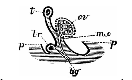 Fig: 7. (Koblenz). Shema normal relationship of the ovary to the parts of the lig. lati. t. - tuba fallopii. ov. - the ovary is covered with embryonic epithelium. br. - lig. teres. bg. - blood vessels. R. R. - lig. lati. then. - mesovarium.