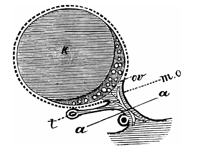 Fig.: 8. (Koblenz.) Cystoma ovarii proprium. m.o.t - cyst, ov. - the surviving ovarian tissue, mo - anatomical leg, a. and. - surgical leg.