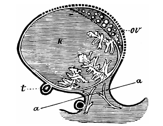 Рис. 8. (Koblenz.) Cystoma ovarii proprium. t — киста, ov. — уцѣлѣвшая ткань яичника, то. — анатомическая ножка, а. а. — хирургическая ножка.