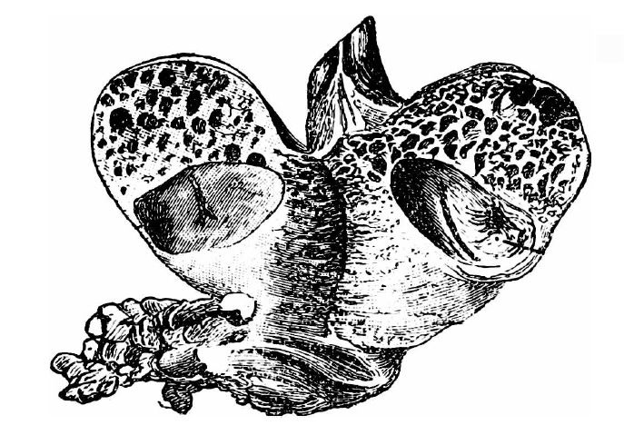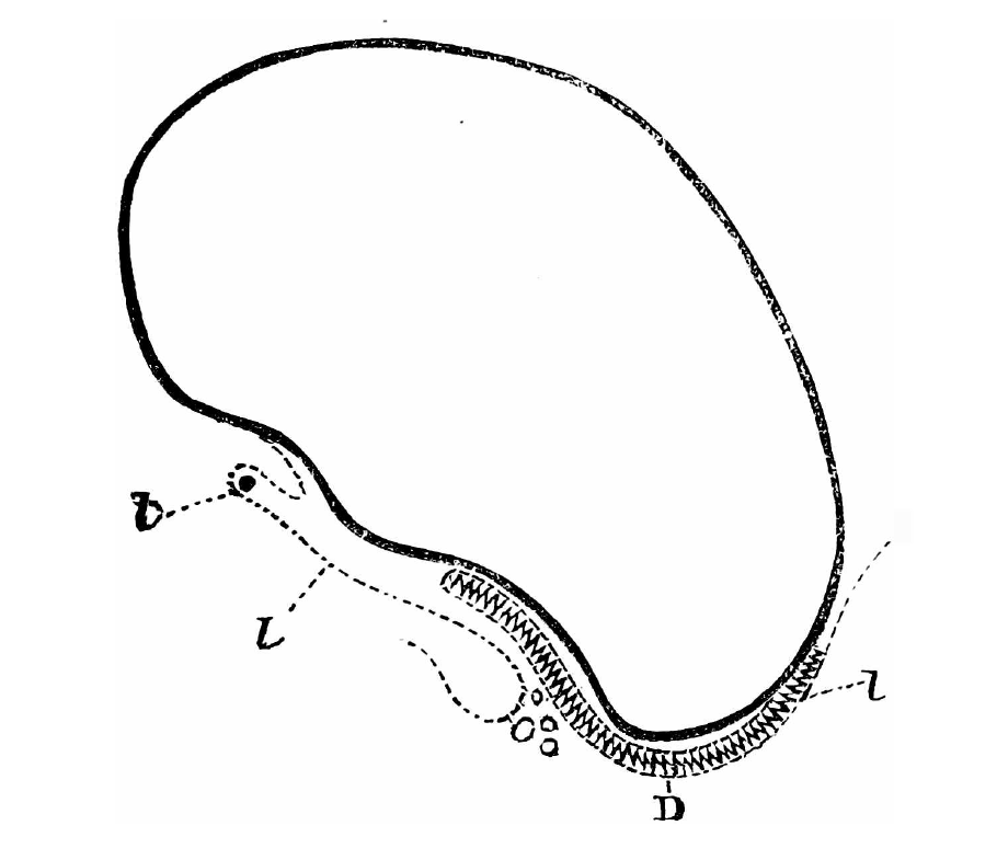 Вторичныя, кисты помѣщаясь въ стѣнкахъ главной, могутъ сильно вдаваться и проминировать въ эту полость и иногда до такой степени, что представляются образованіями, сидящими какъ бы на ножкахъ. Продыравливаніе стѣнокъ вторичныхъ кистъ и соединеніе ихъ полостей съ главною никакъ не связано съ величиною ихъ, иногда уже весьма мелкія кисты имѣютъ на своей верхушкѣ небольшое отверстіе, изъ котораго во время изслѣдованія торчитъ кусокъ густой слизи. Съ теченіемъ времени отверстія дѣлаются все больше и больше, пока наконецъ не останутся только слѣды ихъ въ видѣ серпообразныхъ гребней на внутренней поверхности главной полости. Въ періодѣ увеличенія подобнаго отверстія, когда оно обладаетъ еще рѣзко выраженными гладкими истонченными краями, оно можетъ представляться закупореннымъ сегментомъ одной изъ растущихъ вторичныхъ кистъ со