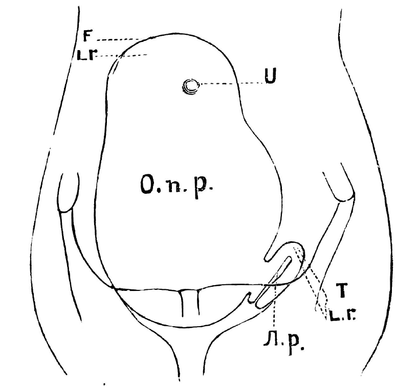U - navel; F — the place of attachment of the right pipe; Lr Lr — places of attachment of round ligaments; T - the place of attachment of the left pipe; O. p. - tumor of the right uterine horn; L. r. - left uterine horn.