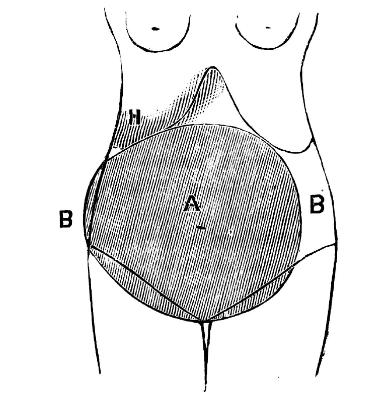 Данныя, получаемыя при помощи перкуссіи при большихъ кистахъ яичника, весьма характерны; площадь распространенія тупаго тона, принадлежа опухоли, имѣетъ приблизительно ея форму и занимаетъ всю переднюю брюшную стѣнку, ограничиваясь кверху кривою линіею границы опухоли, имѣющей выпуклость обращенною кверху, съ боковъ оттѣсненныя петли кишечнаго канала обусловливаютъ тимпаническій тонъ, книзу тупой звукъ опухоли переходитъ въ такой же symphys‘ы. Измѣненіе положенія больной не измѣняетъ границы притупленія и только при кистахъ меньшей величины, болѣе свободно подвижныхъ, оно in toto можетъ нѣсколько смѣщаться въ сторону, смотря по тому, на который бокъ будетъ положена больная. Исключенія изъ этого представляютъ кисты невполнѣ наполненныя (kystes uniloculaires flasques); мѣняя свою форму съ измѣненіемъ положенія, они обусловливаютъ также соотвѣтственное измѣненіе площади притупленія.