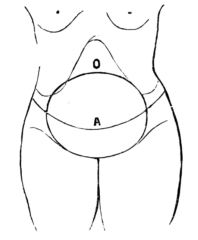 Fig.: 19. Lines of dullness in the ovarian cyst and in ascites in the standing position of the patient (Edis). A - the upper limit of dullness with abdominal dropsy, O - the border of dullness with ovarian tumor.