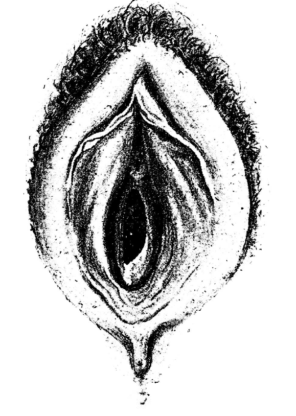 А. Т., 27 лѣтъ, крестьянка Московской губ., прислуга, хорошаго тѣлосложенія и питанія, высокаго роста, поступила по родамъ въ Гаваньскій родильный пріютъ 22 сент. 1893. I—para. Первыя крови на 13 году, типъ по 6 дней черезъ 4 нед. Послѣдніе регулы въ январѣ 1893 г. Тазъ: 24, 27, 19, 34; прямой выходъ 13,5, поперечный 12,5. При поступленіи въ пріютъ шейка матки сглажена, открыта на 31/2 поперечныхъ пальца, водъ нѣтъ. При осмотрѣ наружныхъ половыхъ частей и входа во влагалище констатировано: большія губы нормальны,—богаты жировой тканью; малыя губы по срединѣ своего протяженія, на пространствѣ до 2-хъ сантиметровъ сливаются съ большими губами; при раздвиганіи губъ констатируется полное, рѣзко выраженное кольцо дѣвственной плевы, особенно мясистое въ нижней своей части, гдѣ кольцо значительно выдается впередъ, если можно выразиться, въ видѣ мясистаго грибка, высота этой нижней части кольца около 1,5 сант.