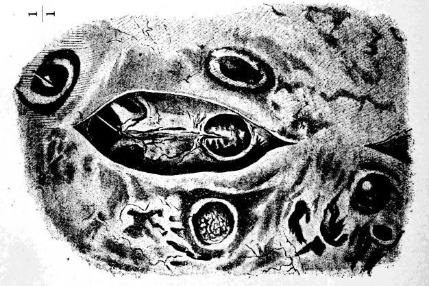 Вслѣдъ за некротизаціей краевъ вшитой въ наружную рану капсулы получилось нагноеніе брюшной раны ниже пупка, края которой разошлись на значительномъ протяженіи; въ глубинѣ были видны соединенные швами апоневрозы и пучки прямыхъ мышцъ. Можетъ быть не произошло затека гноя въ брюшную полость отчасти благодаря примѣненію мышечно-апоневротическихъ швовъ. Некротизированныя мѣста были обильно присыпаемы стерилизованнымъ висмутомъ.