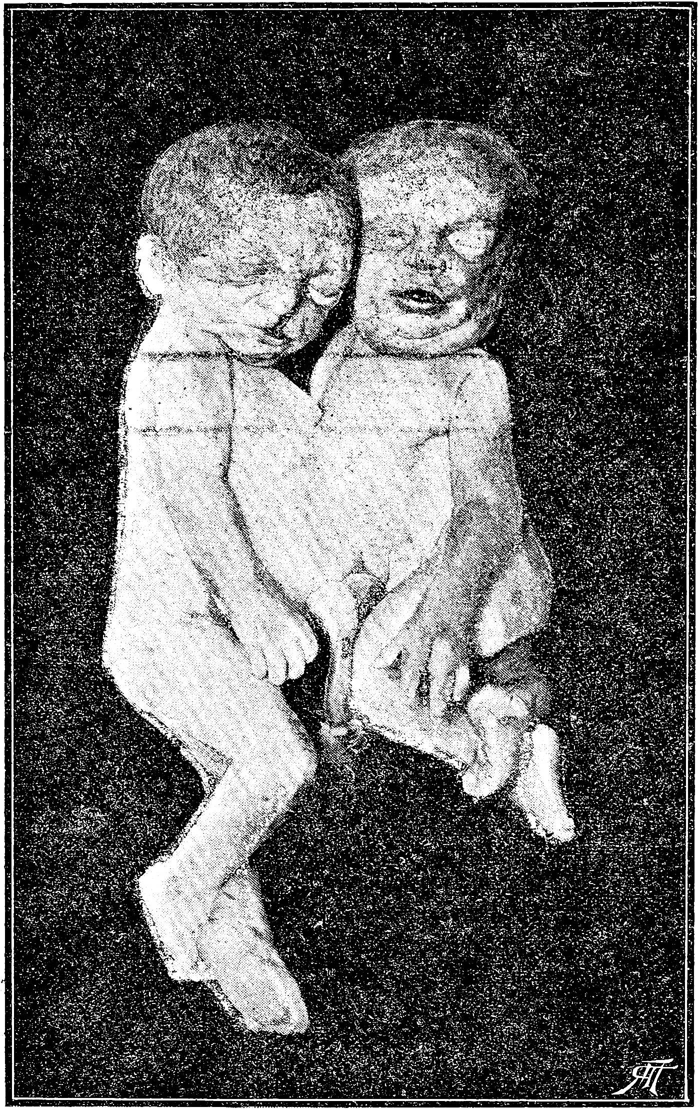 On October 30, at 10 pm, in the city of Mogilev, a Jewess N. gave birth to triplets, the first fetus was born alive, and then, without much difficulty, the conjoined twins depicted in the attached figure were born dead, both in head presentation.