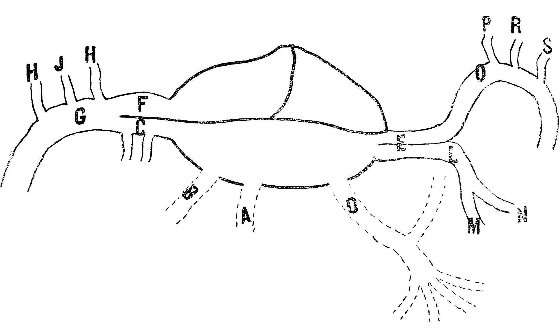 считать нижнею полою веною. Сосудъ (с), отходящій справа изъ предсердія, по своему строенію и по присутствію клапановъ представляетъ артерію, отъ которой на нѣкоторомъ разстояніи отходятъ двѣ легочныя артеріи къ обоимъ легкимъ праваго плода. Затѣмъ этотъ сосудъ соединяется съ сосудомъ (f), исходящимъ изъ праваго желудочка и затѣмъ общимъ стволомъ (g) образуетъ дугу аорты, далѣе грудную и брюшную ея часть. Изъ дуги правой аорты отходятъ три сосуда къ верхней части туловища и къ головкѣ (h, і, k—anon., carot, subcl). Слѣва отъ предсердія отходятъ два слившихся артеріальныхъ сосуда (е), которые въ нѣкоторомъ разстояніи отъ сердца раздѣляются: одинъ (l) идетъ двумя вѣтвями къ легкимъ (m, n), другой образуетъ дугу аорты (о), отъ которой отходятъ (р, r, s) три сосуда. Затѣмъ дуга аорты переходитъ въ грудную и брюшную часть. Отъ брюшной аорты одного и другого плода съ лѣвой стороны отходятъ двѣ артеріальныя вѣтви, которыя направляются къ передней брюшной стѣнкѣ, проходятъ между ея тканями къ пупку и здѣсь сливаются въ одну пупочную артерію проходящую въ пупочномъ канатикѣ. Пупочная вена одна и идетъ однимъ стволомъ къ печени. У близнецевъ два отдѣльныхъ желудка, двѣ двѣнадцатиперстныя кишки, сливающіяся въ одну общую тощую кишку, которая въ свою очередь дѣлится на двѣ подвздошныя, переходящія въ отдѣльныя толстыя кишки. Толстая кишка лѣваго близнеца значительно больше растинута толстой кишки праваго. Двѣ прямыя кишки и два заднепроходныхъ отверстія. Двѣ печени, сросшіяся своими задними краями по срединѣ и какъ бы сложенныя вдвое. Селезенки отдѣльныя. У праваго плода двѣ почки, у лѣваго одна значительно большей величины. Мочевой пузырь и у одного и у другаго близнеца развитъ нормально. Матка, фаллопіевы трубы и влагалище у праваго близнеца нормальны, у лѣваго въ зачаточномъ состояніи.