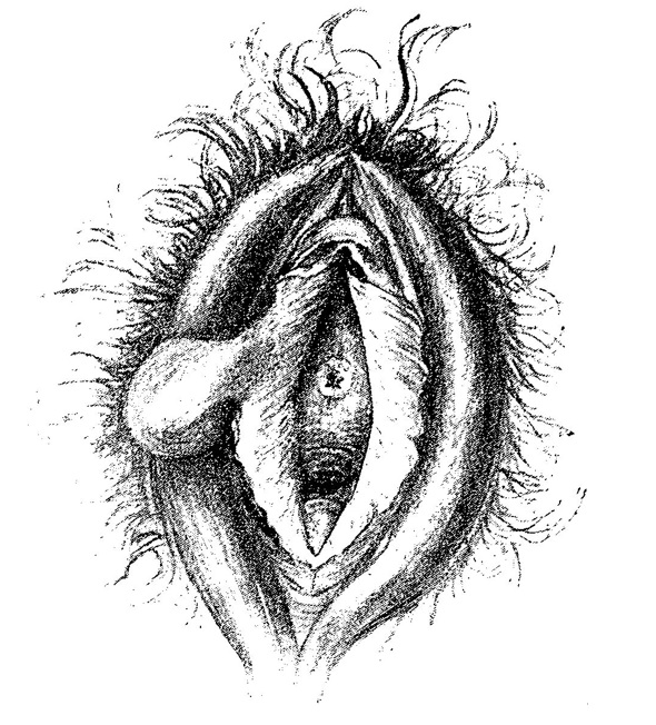 На правой малой губѣ, въ верхней ея трети, по направленію къ клитору, и именно на свободномъ краю губы, имѣется опухоль, величиною съ большой грецкій орѣхъ. Такъ какъ опухоль начинается изъ края губы, то послѣдняя на разстояніи одного сантиметра составляетъ какъ бы ножку опухоли расширяющуюся сразу въ широкую часть и свисающую по направленію книзу. Стѣнки опухоли составляются непосредственнымъ продолженіемъ наружныхъ покрововъ малой губы. Форма опухоли совсѣмъ круглая. Наружная поверхность гладкая. На внутренней поверхности, обращенной къ vestibulum vulvae, имѣются нѣсколько цятенъ бѣло-сѣроватаго цвѣта, рѣзко отличающихся отъ темноватой окраски остальной части покрововъ какъ губъ, такъ и самой опухоли. Консистенція опухоли тѣстоватая. При ощупываніи никакой болѣзненности А—ва не ощущаетъ.