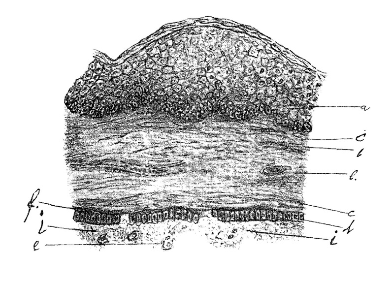 Микроскопическое изслѣдованіе. (Рис. 2-й). Всѣ три, упомянутые уже при макроскопическомъ изслѣдованіи, слоя кистовидной опухоли совершенно ясно опредѣляются также подъ микроскопомъ. Разсматривая препараты при окул. 5 системѣ 3 Verick’a и идя снаружи внутрь, видимъ слѣдующее: слой многослойнаго поверхностнаго эпителія съ рѣзко окрашенными въ фіолетовый цвѣтъ ядрами (а). Этотъ эпителіальный слой задается въ видѣ папиллъ, рѣзко отграниченныхъ, въ подлежащую соединительную ткань. Эта соединительная ткань состоитъ изъ 2 частей: двухъ крайнихъ (с с), состоящихъ изъ волоконъ плотно прилегающихъ другъ къ другу съ незначительнымъ количествомъ веретенеобразныхъ клѣтокъ и одной промежутной (b b), состоящей изъ рыхлой соединительной ткани, пучки которой, переплетаясь между собою, образуютъ различной величины промежутки. Весь этотъ соединительнотканный слой окрашенъ въ свѣтло-зеленый цвѣтъ. Къ этому соединительно-тканному слою непосредственно прилежитъ съ внутренней стороны полости слой клѣтокъ цилиндрическаго эпителія, расположенныхъ въ одинъ рядъ (d). Клѣтки эти должны быть отнесены къ типу узкоцилиндрическому. Каждая клѣтка состоитъ изъ нѣжной протоплазмы, окрашенной въ розово-желтый цвѣтъ и ядеръ, при основаніи клѣтокъ, окрасившихся въ рѣзко фіолетовый цвѣтъ. Въ нѣкоторыхъ ядрахъ замѣтно ясное дѣленіе ихъ—каріокинезъ—причемъ фигуры получаются то лучистыя, то клубковидныя. Цилиндрическій эпителій, выстилая внутреннюю поверхность кисты, по мѣстамъ отсталъ въ видѣ узкой ленты, и тогда дѣлается замѣтною плотная соединительная ткань, служащая основой для цилиндрическаго эпителія и отдѣляющаяся отъ послѣдняго очень тонкою, прозрачною, безструктурною полоскою (f). Что касается до бѣлой маркой массы, облѣпляющей внутреннюю поверхность кисты, то она состоитъ почти изъ совсѣмъ безструктурной массы, невоспринимающей окраски (i і). Кое гдѣ въ этой массѣ встрѣчаются какъ бы слѣды эпителіальныхъ клѣтокъ, но нѣсколько большихъ, чѣмъ описанныя клѣтки цилиндрическаго эпителія. Кромѣ того, разрушенныя эпителіальная клѣтки въ безструктурной массѣ отличаются также и по формѣ отъ описанныхъ клѣтокъ. Онѣ даютъ впечатлѣніе остатковъ какъ бы отъ многоугольныхъ или плоскихъ клѣтокъ (е) и т. д. Протоплазма подобныхъ клѣтокъ, гдѣ она осталась, тоже окрашивается въ розово-желтый цвѣтъ, ядра же въ рѣзко-фіолетовый. Кромѣ того, среди безструктурной массы встрѣчаются рѣзко окрашенныя въ фіолетовый цвѣтъ круглыя или овальныя образованія—ядра клѣтокъ, лишенныхъ, вслѣдствіе распада, протоплазмы. Наконецъ, въ этой же массѣ попадаются очень мелкія, блестящія, сильно преломляющія свѣтъ, точечки жировыя капельки. Что касается сосудовъ въ соединительно-тканномъ слоѣ стѣнки, то въ общемъ, они не представляютъ ничего особеннаго ни въ своемъ распредѣленіи, ни въ строеніи стѣнокъ. Всѣ кровеносные сосуды въ стѣнкѣ почти совершенно пусты.