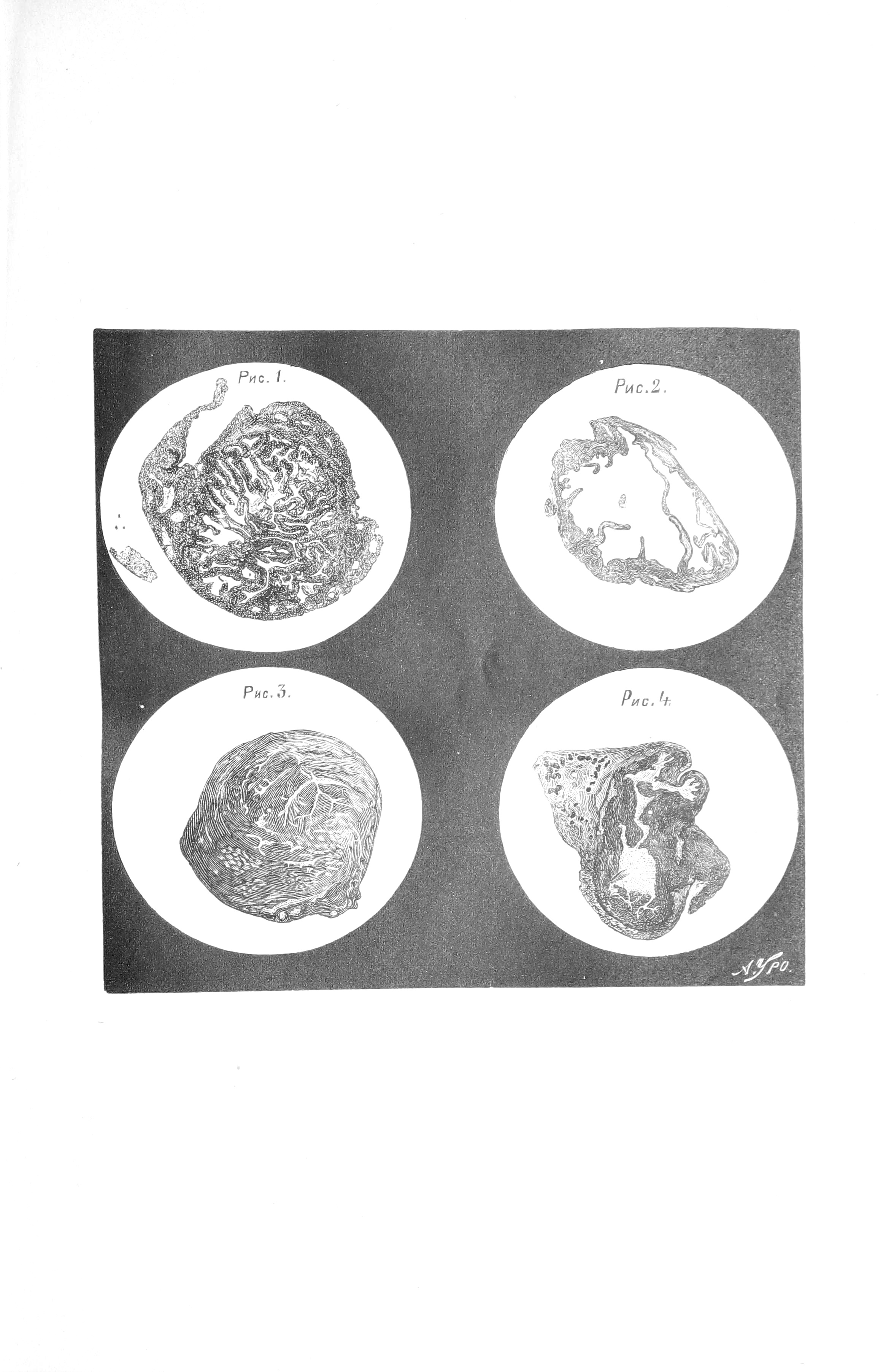 № 1. Препаратъ нормальной трубы кролика въ средней части. № 2. Препаратъ ранняго Hydrosalpinx’a кролика средней части. № 3. Препаратъ нормальной трубы кошки въ средней части. № 4. Препаратъ ранняго Hydrosalpinx’a кошки средней части.