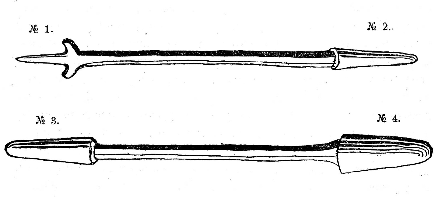 Этотъ рисунокъ изображаетъ общій видъ расширителей; размѣры конусовъ уменьшены, приблизительно, вдвое. (Длина стержня уменьшена немного меньше). №№ соотвѣтствуютъ №№ Tait [2]).