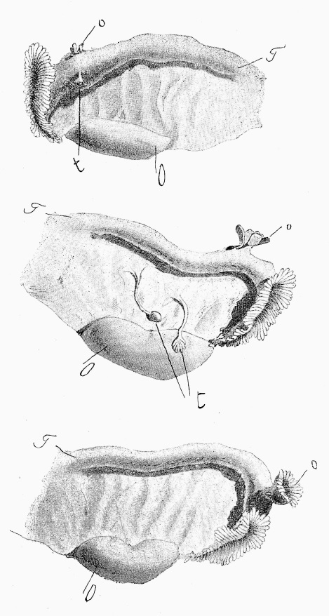 Интересны мнѣнія авторовъ, объ исторіи развитія интересующихъ насъ придатковъ, обоснованныя нѣкоторыми просто на различнаго рода чисто апріорныхъ предположеніяхъ, другими же на тщательно изслѣдованной микроскопической картинѣ. Въ мои планы, само собою, не входитъ намѣреніе произвести критическую оцѣнку относящихся сюда работъ, я лишь позволю себѣ сопоставить взгляды и мнѣнія авторовъ о происхожденіи и первомъ развитіи придаточныхъ отверстій и трубъ.
