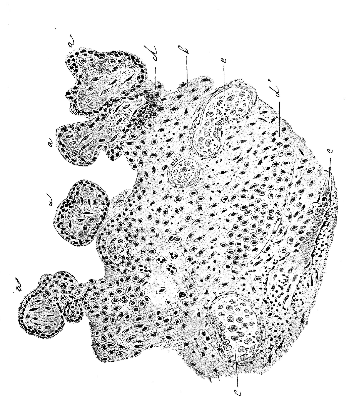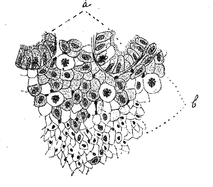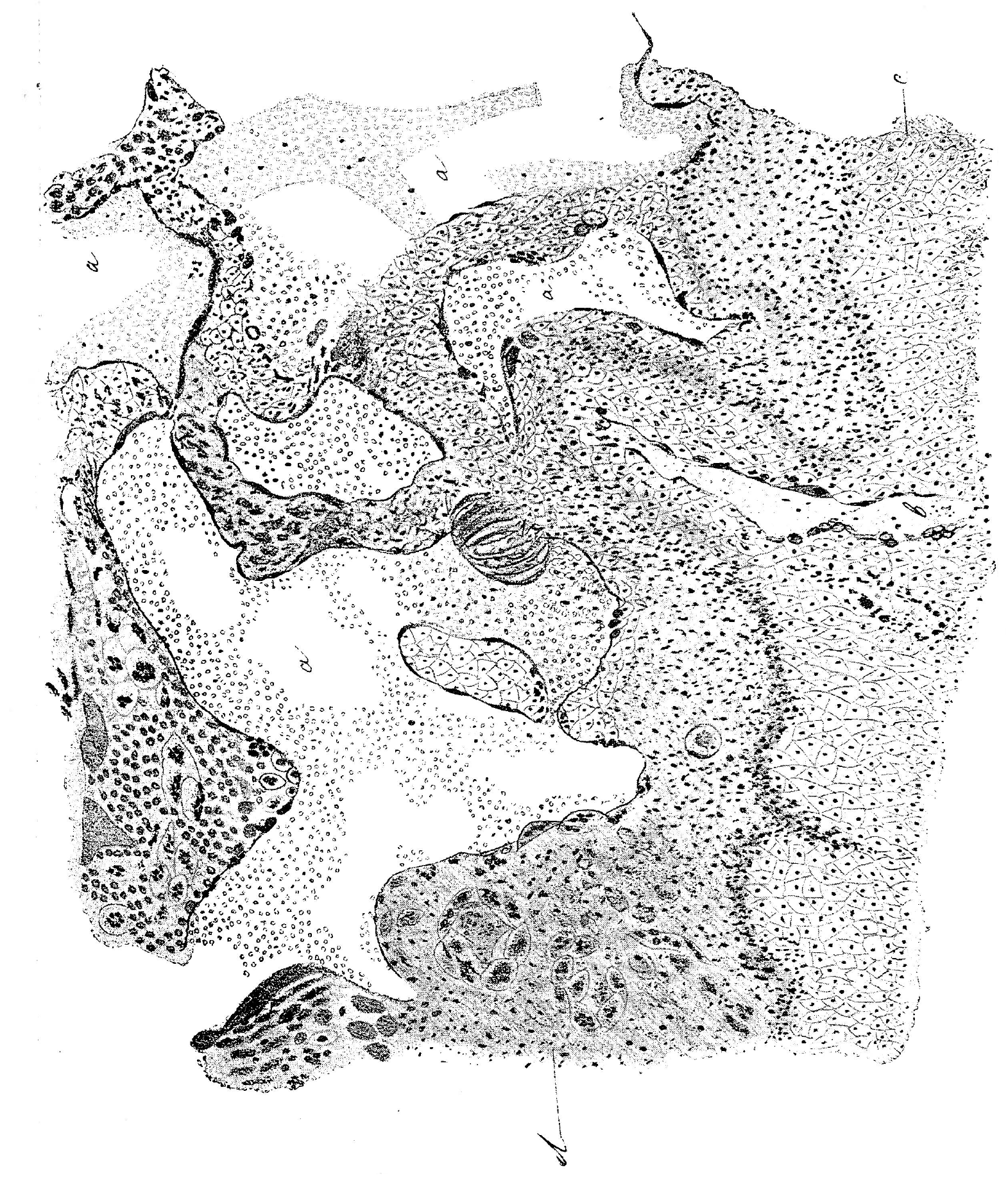 Многочисленныя почки, которыя отходятъ съ различныхъ сторонъ отъ болѣе крупныхъ ворсинокъ и составляютъ столь характерный аттрибутъ ворсинки—представляютъ по своему строенію ничто иное, какъ сейчасъ описанный многоядерный plasmodium. На этомъ же препаратѣ замѣчаются мѣста, гдѣ глубокій клѣточный слой измѣняется, клѣтки его уплощаются, становятся веретенообразными или даже вовсе пропадаютъ. За то plasmodium лежитъ болѣе широкой полосой.