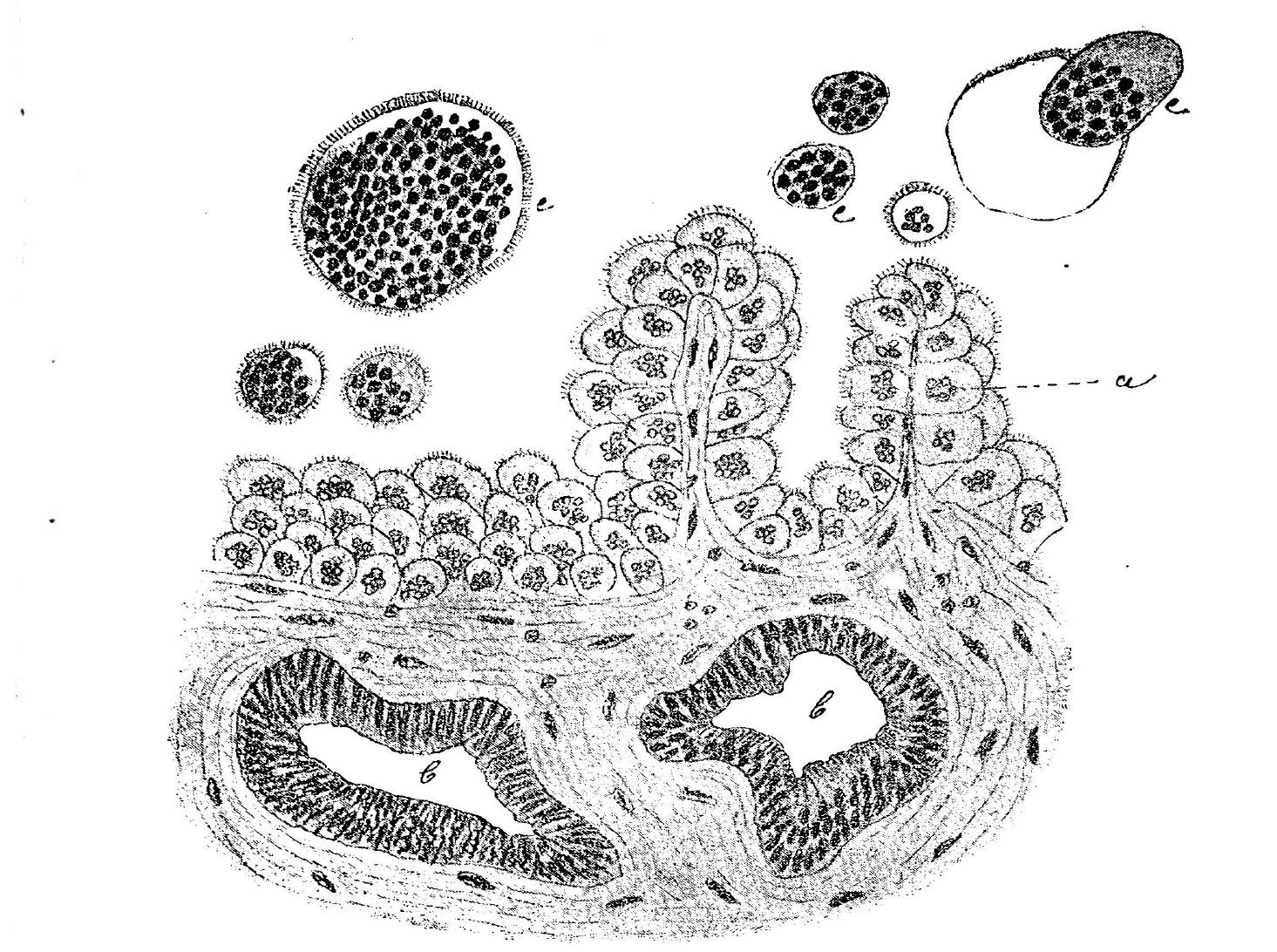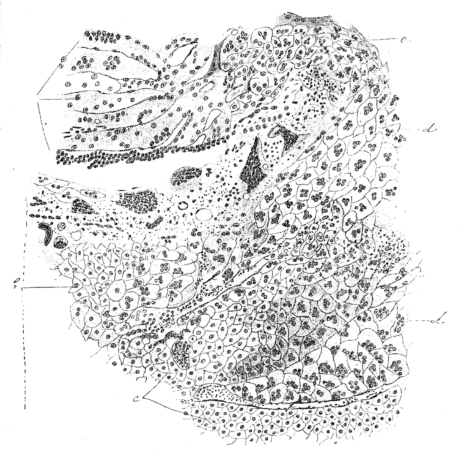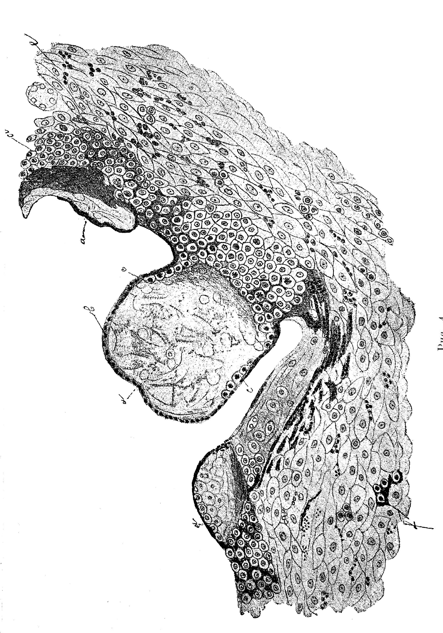 Многочисленныя почки, которыя отходятъ съ различныхъ сторонъ отъ болѣе крупныхъ ворсинокъ и составляютъ столь характерный аттрибутъ ворсинки—представляютъ по своему строенію ничто иное, какъ сейчасъ описанный многоядерный plasmodium. На этомъ же препаратѣ замѣчаются мѣста, гдѣ глубокій клѣточный слой измѣняется, клѣтки его уплощаются, становятся веретенообразными или даже вовсе пропадаютъ. За то plasmodium лежитъ болѣе широкой полосой.