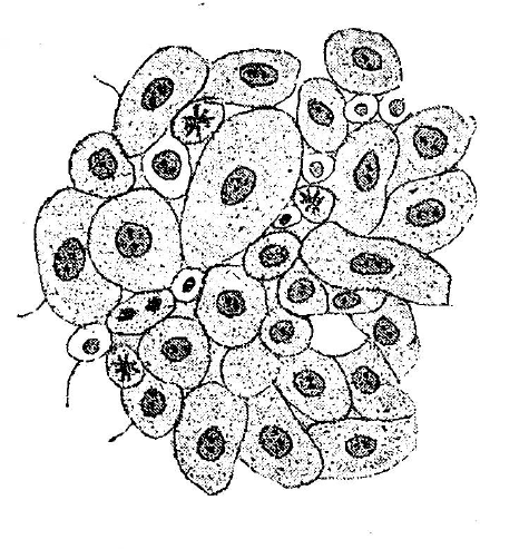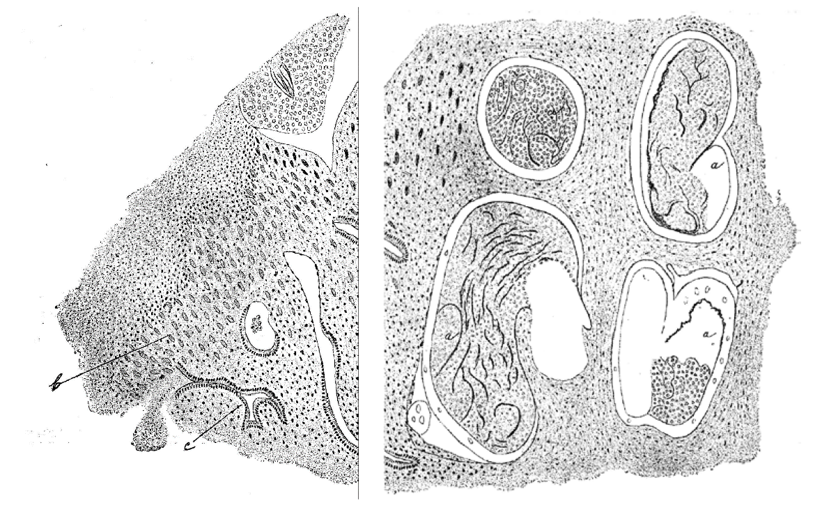Въ болѣе раннихъ періодахъ беременности, на разрѣзахъ между ворсинами встрѣчаются въ различныхъ мѣстахъ большія или меньшія группы клѣтокъ. Клѣтки эти имѣютъ полиэдрическую форму, съ крупными ядрами и нѣжно-зернистой протоплазмой. Многія изъ нихъ заключаютъ ядра въ состояніи дѣленія. По окружности такого клѣточнаго гнѣзда, располагается syncytium непрерывно или мѣстами прерываясь. Возникаетъ вопросъ, что это за клѣточныя скопленія?