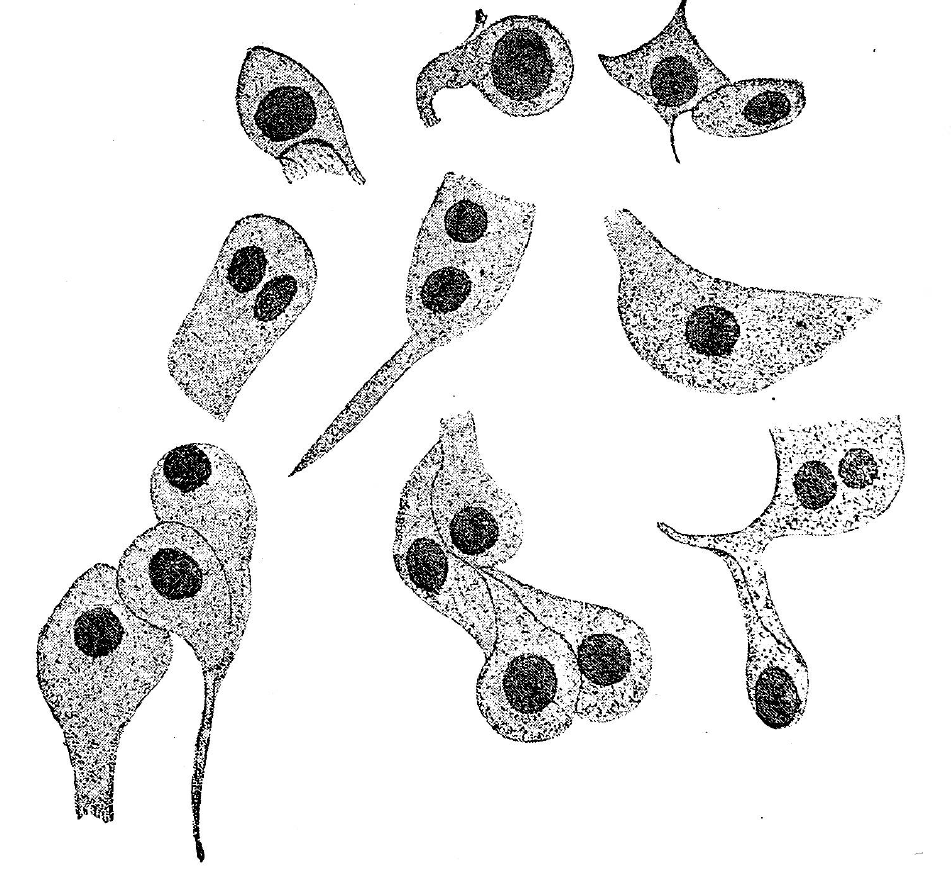 Какъ на особенность этого отдѣла беременнаго рога кролика, слѣдуетъ указать на присутствіе особаго рода клѣтокъ, впервые описанныхъ Minot, подъ именемъ Monsterzells. Это гигантскія клѣтки sui generis (рис. 14 а и b). На разрѣзахъ тѣло ихъ колеблется въ размѣрахъ и бываетъ иногда такъ велико, что занимаетъ собою сплошь все пространство между сосѣдними железами. Форма гигантовъ разнообразная. Протоплазма ихъ гомогенная или нѣжно-зернистая, при тонкой обработкѣ (Флеммингъ) вся поверхность ея точно исчерчена тонкими кружечками. Какой-либо клѣточной оболочки не существуетъ. Въ клѣткѣ лежитъ одно, рѣже два колоссальныхъ же ядра овальной или круглой формы; нельзя не замѣтить, что оно имѣетъ будто свою оболочку, въ которой лежитъ нѣсколько крупныхъ же ядрышекъ (величиною равныхъ ядрамъ элементовъ сосѣднихъ тканей). Чаще ядра находятся въ состояніи распаденія, хроматолиза; получаются зерна, зернышки, комочки различной формы и палочки — все это густо окрашивается. Обработывая свѣжій препаратъ 30% растворомъ ѣдкаго кали и расщепляя его иглами по истеченіи нѣсколькихъ минутъ, удается изолировать гиганты. Онѣ такъ велики, что на микроскопическихъ срѣзахъ не могутъ попасть цѣликомъ. Изолированныя онѣ имѣютъ видъ колоссальныхъ колбъ и мѣшковъ, съ однимъ, рѣже двумя толстыми же отростками на противоположныхъ концахъ. Совершенно отдѣлить ихъ отъ окружающей соединительной ткани или сосѣднихъ сосудовъ не удается. Послѣдніе точно спаяны съ ними. Вся поверхность протоплазмы гигантовъ усѣяна нѣжными контурами кружечковъ.
