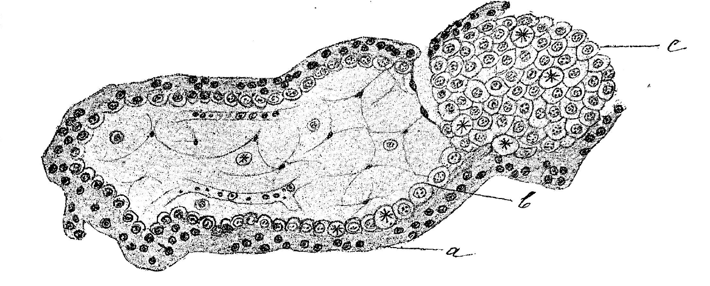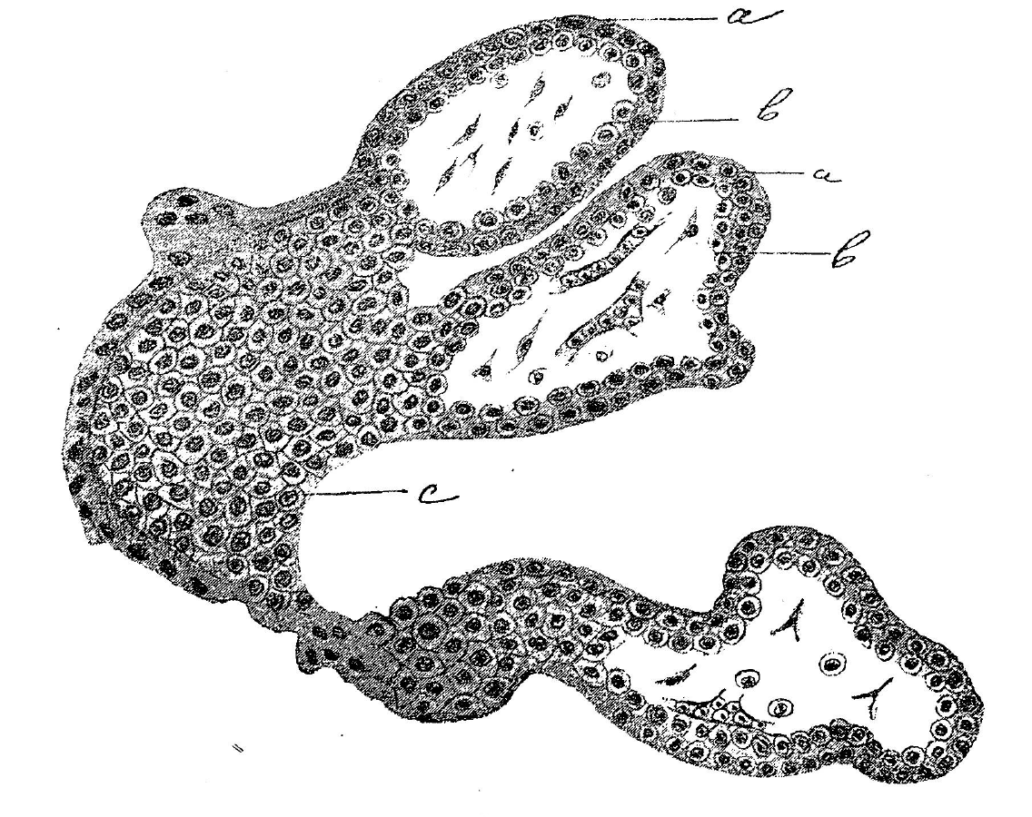 Fig.: 5. Preparation for 3 week abortion: a — syncytium s. plasmodium, b — cell layer (Zellschicht) Langhans’s, c — intervillous cell nest (Zellknoten) Langhans’s.